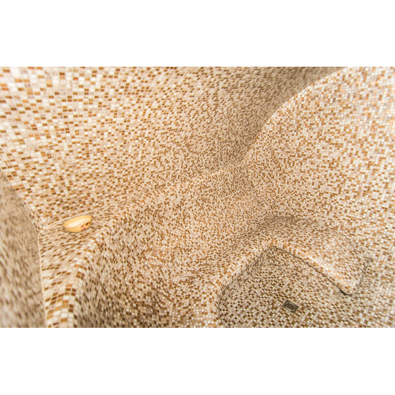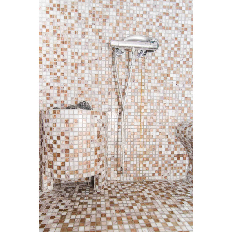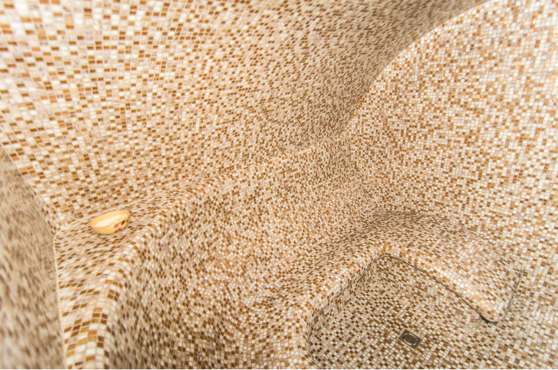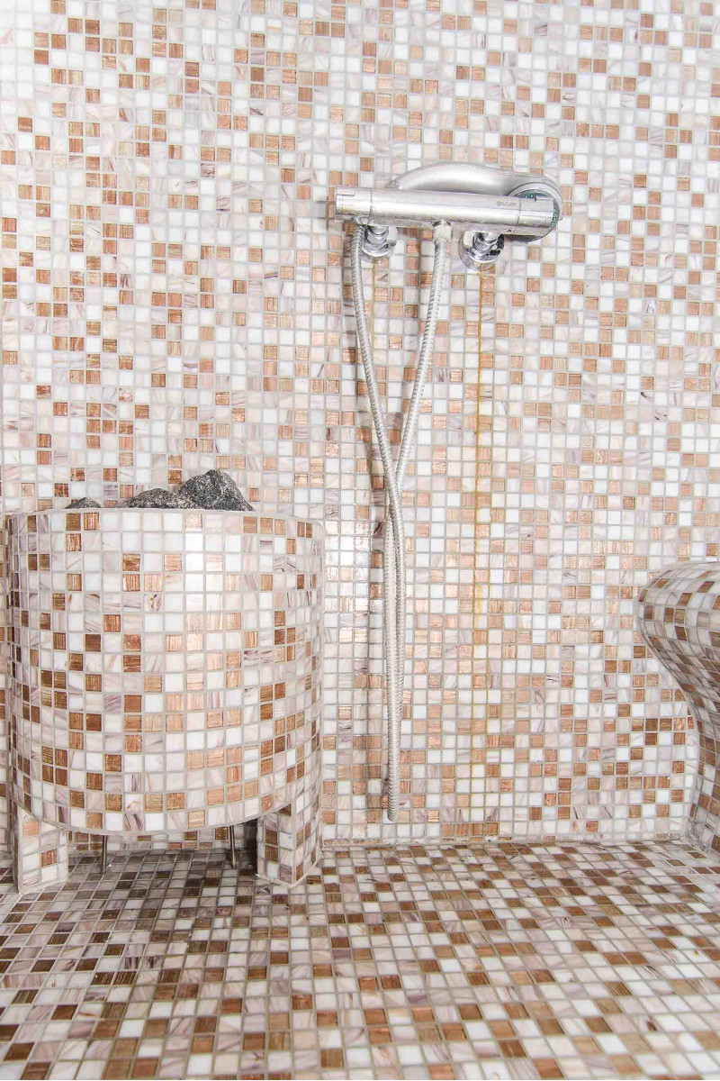 Apdaila - neutralių spalvų grūsto stiklo mozaikinės plytelės.