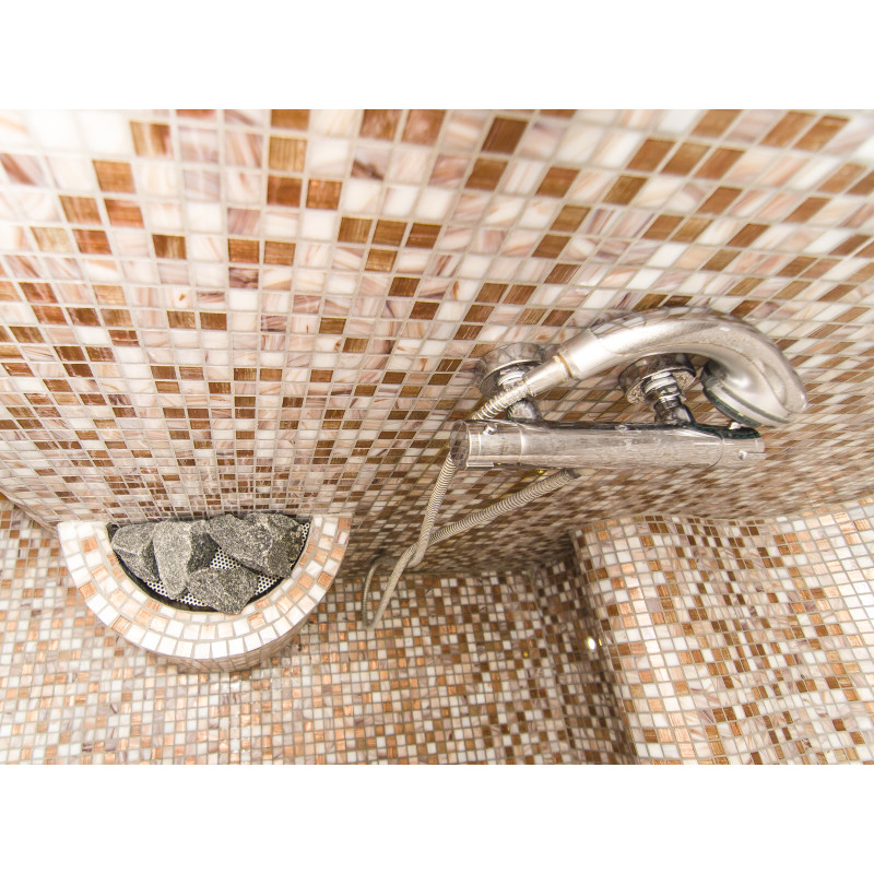 Garų vaza atlieka apsaugos nuo garo vamzdžio funkciją, per kurį garai patenka į pirtį, dekoruota olivino diabazo akmenimis.