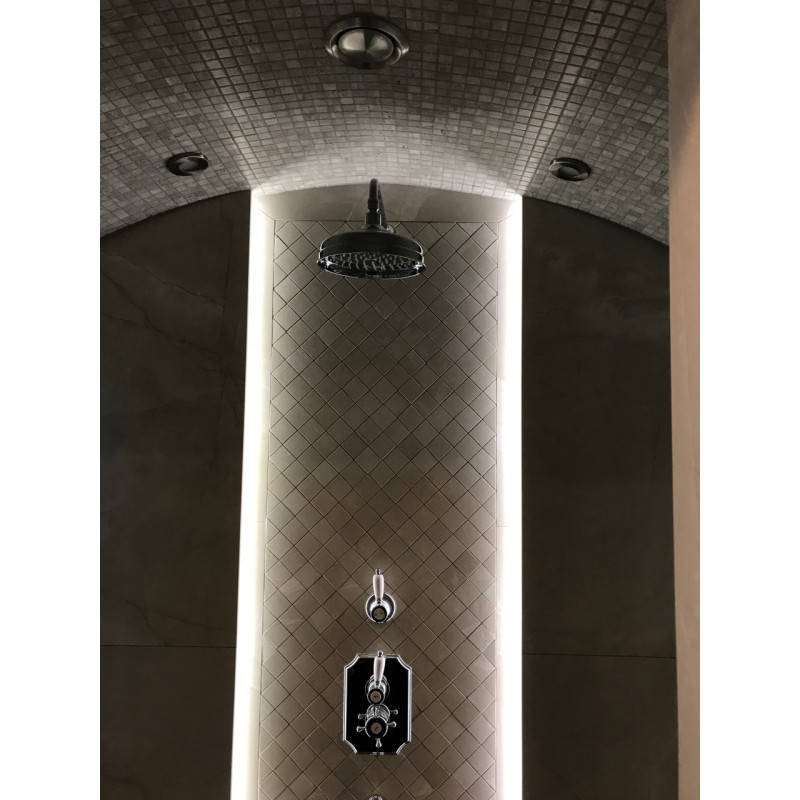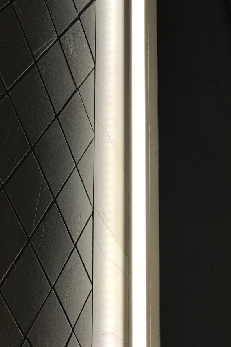 Įmontuota LED juosta po gultais, sienose ir keturi šviestuvėliai lubose.