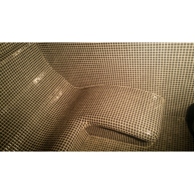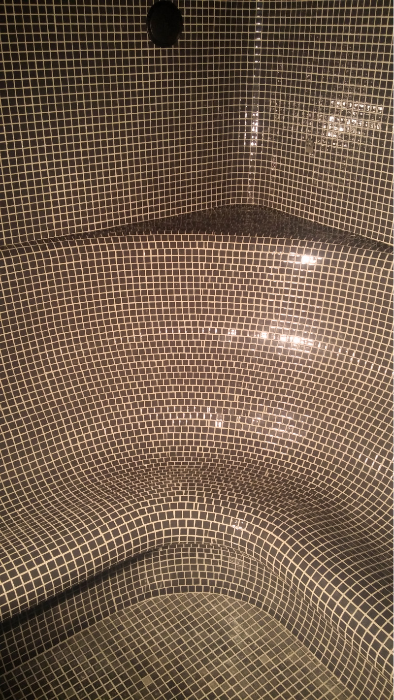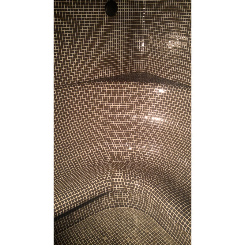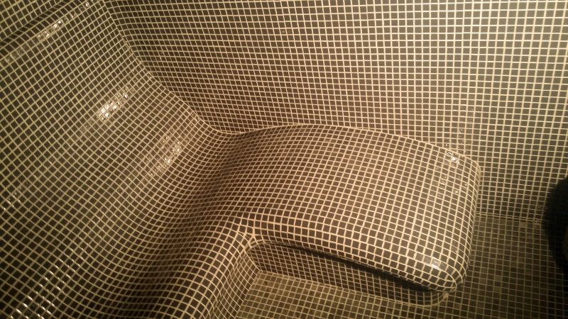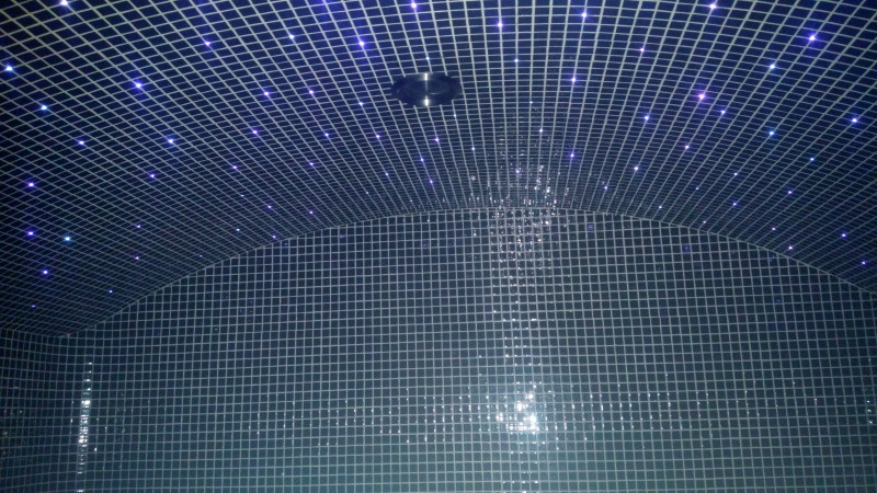 Apdaila - visa pirtis dekoruota grūsto stiklo mozaikinėmis plytelėmis.