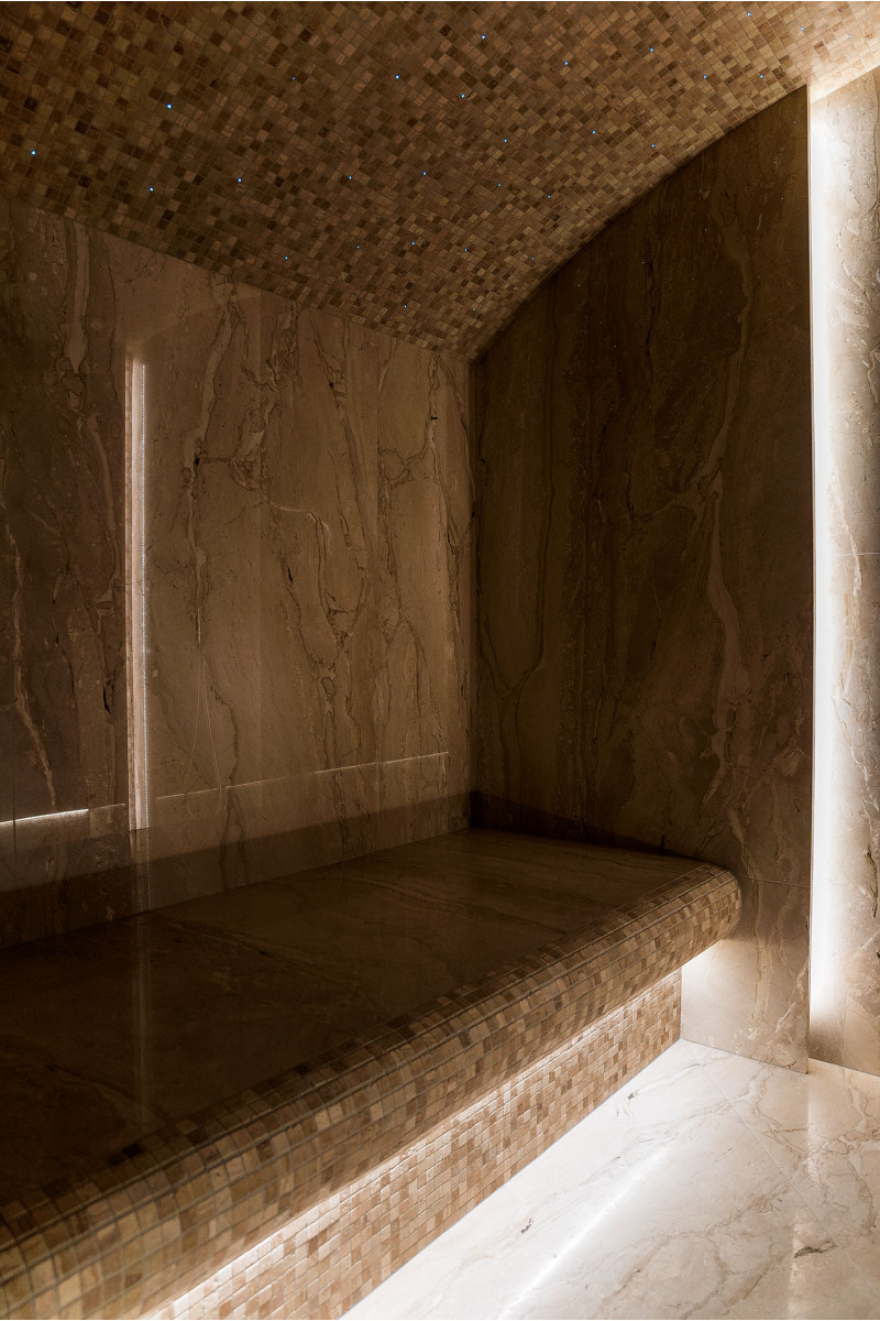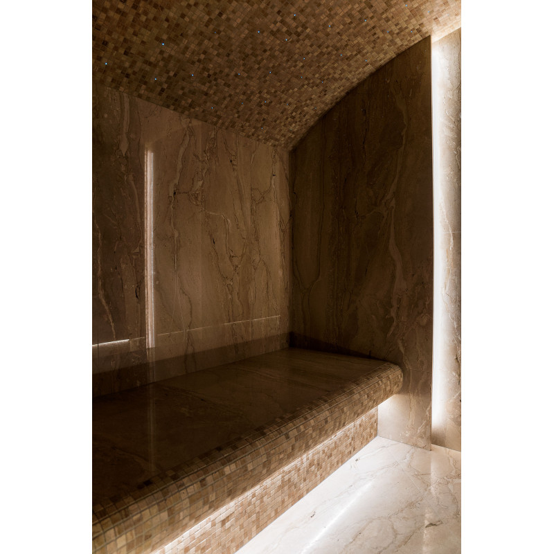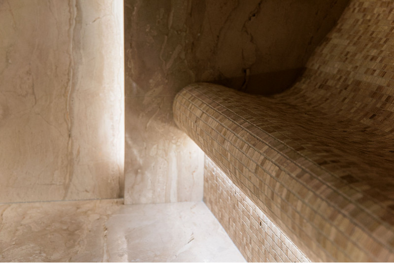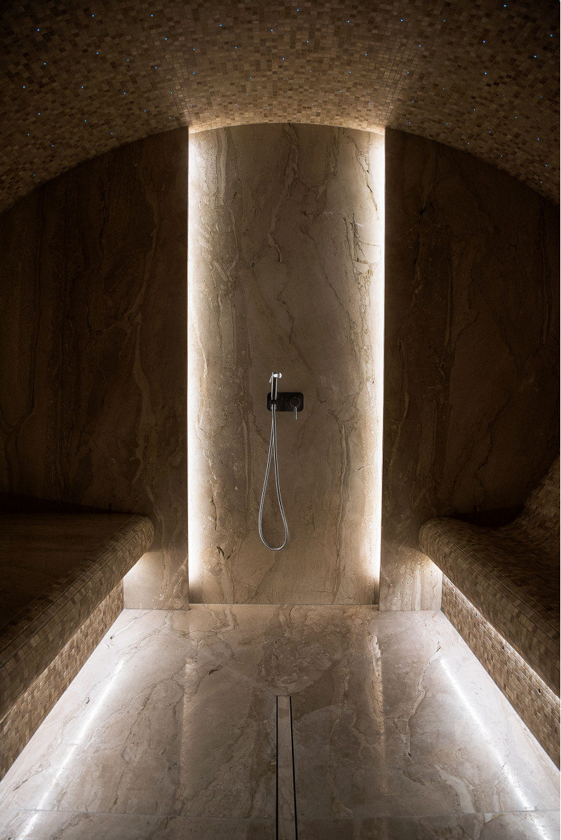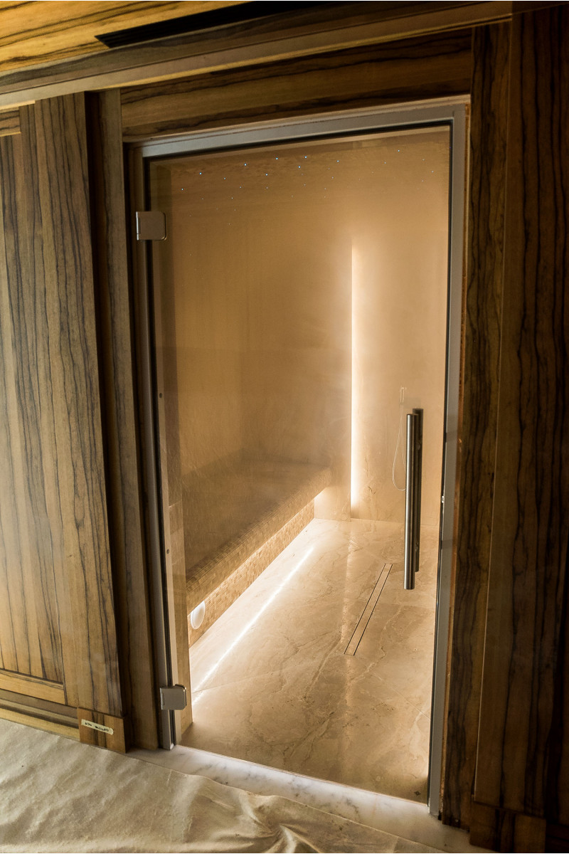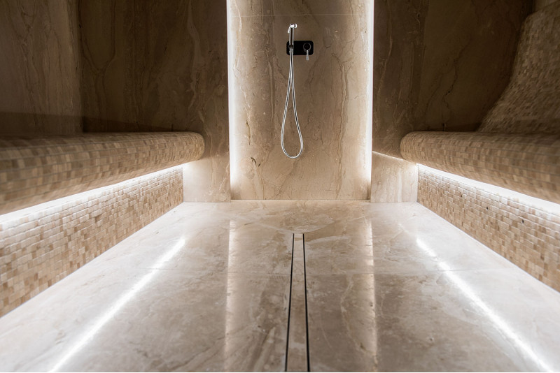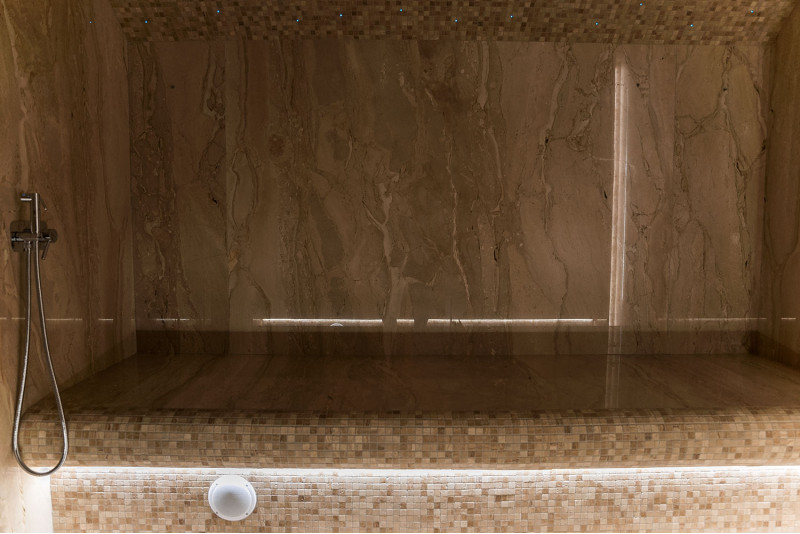 Garinės pirties sienos klijuotos marmuro plokštėmis, gultai ir lubos - marmuro mozaikos plytelėmis. Vienas iš gultų - platesnis - skirtas gulėti, kitas - su išformuotu ergonomišku išlinkiu - sėdėjimui. Pirtis šildoma 9 kW Pego garo generatoriumi, kuris valdomas lietimui jautriu valdymo pulteliu Fasel. Pirties apšvietimas - LED po gultais ir sienose, "Žvaigždėto dangaus" sistema sumontuota lubose. Kvapų pompa skleidžia malonų aromatą ir šviežumą pirtyje.