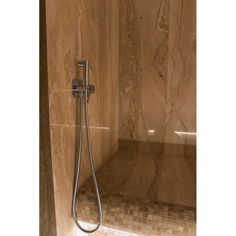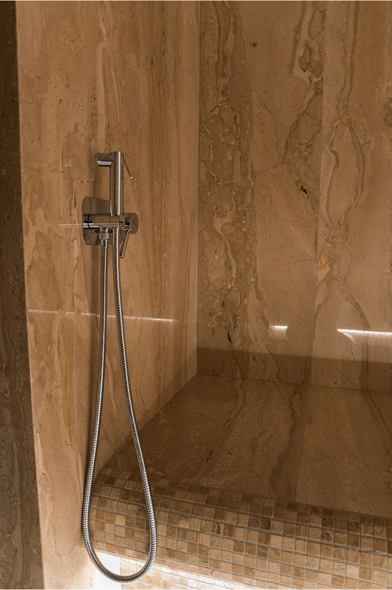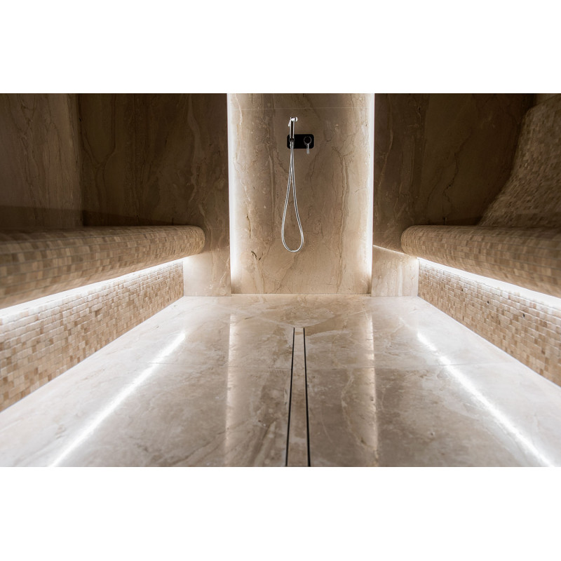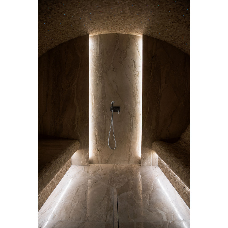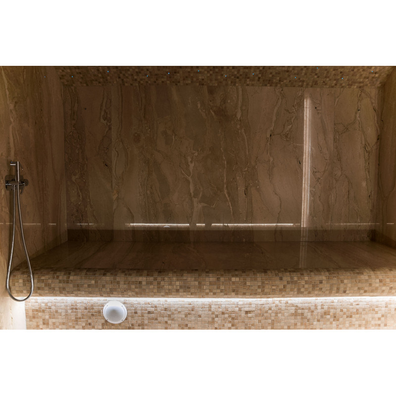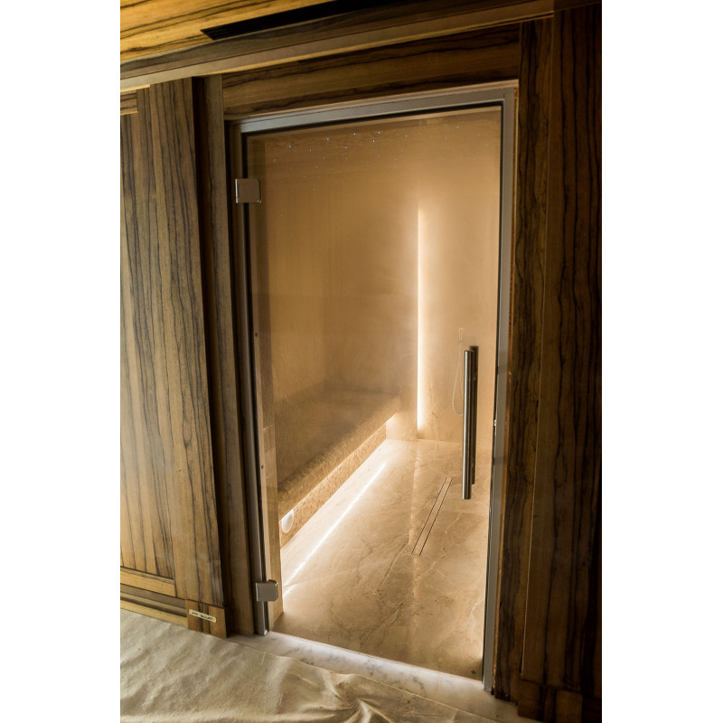 Garinės pirties sienos klijuotos marmuro plokštėmis, gultai ir lubos - marmuro mozaikos plytelėmis. Vienas iš gultų - platesnis - skirtas gulėti, kitas - su išformuotu ergonomišku išlinkiu - sėdėjimui. Pirtis šildoma 9 kW Pego garo generatoriumi, kuris valdomas lietimui jautriu valdymo pulteliu Fasel. Pirties apšvietimas - LED po gultais ir sienose, "Žvaigždėto dangaus" sistema sumontuota lubose. Kvapų pompa skleidžia malonų aromatą ir šviežumą pirtyje.