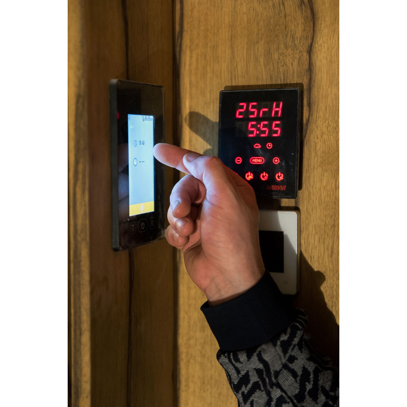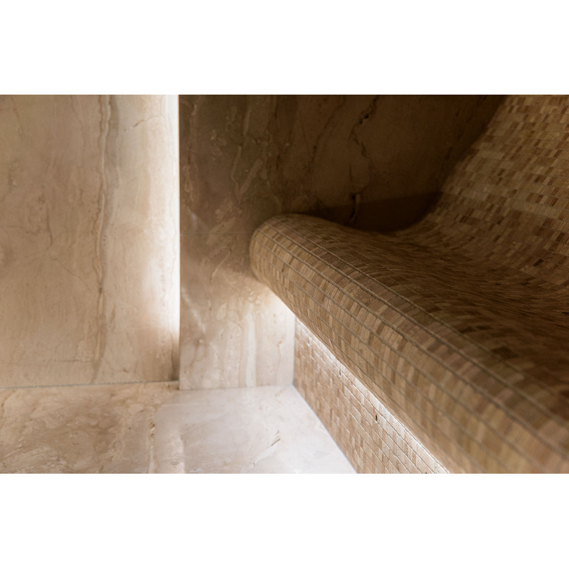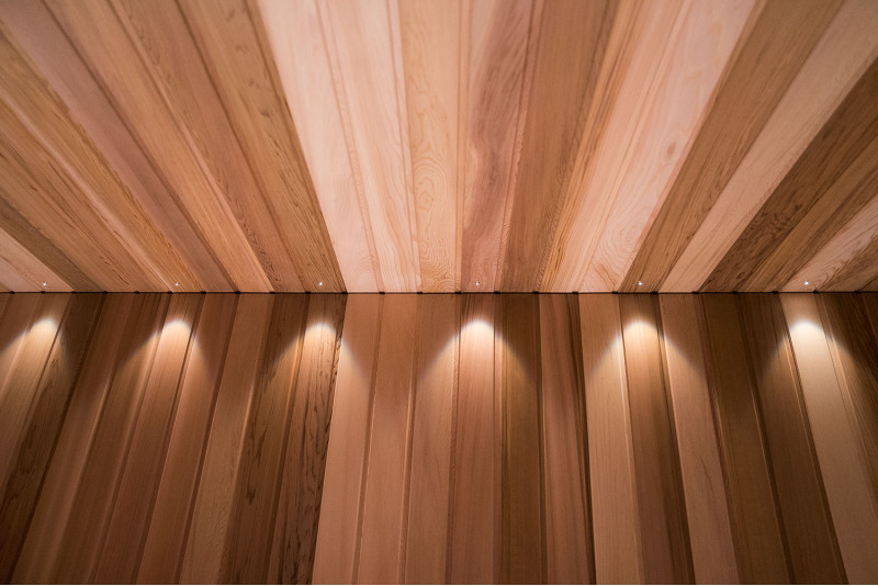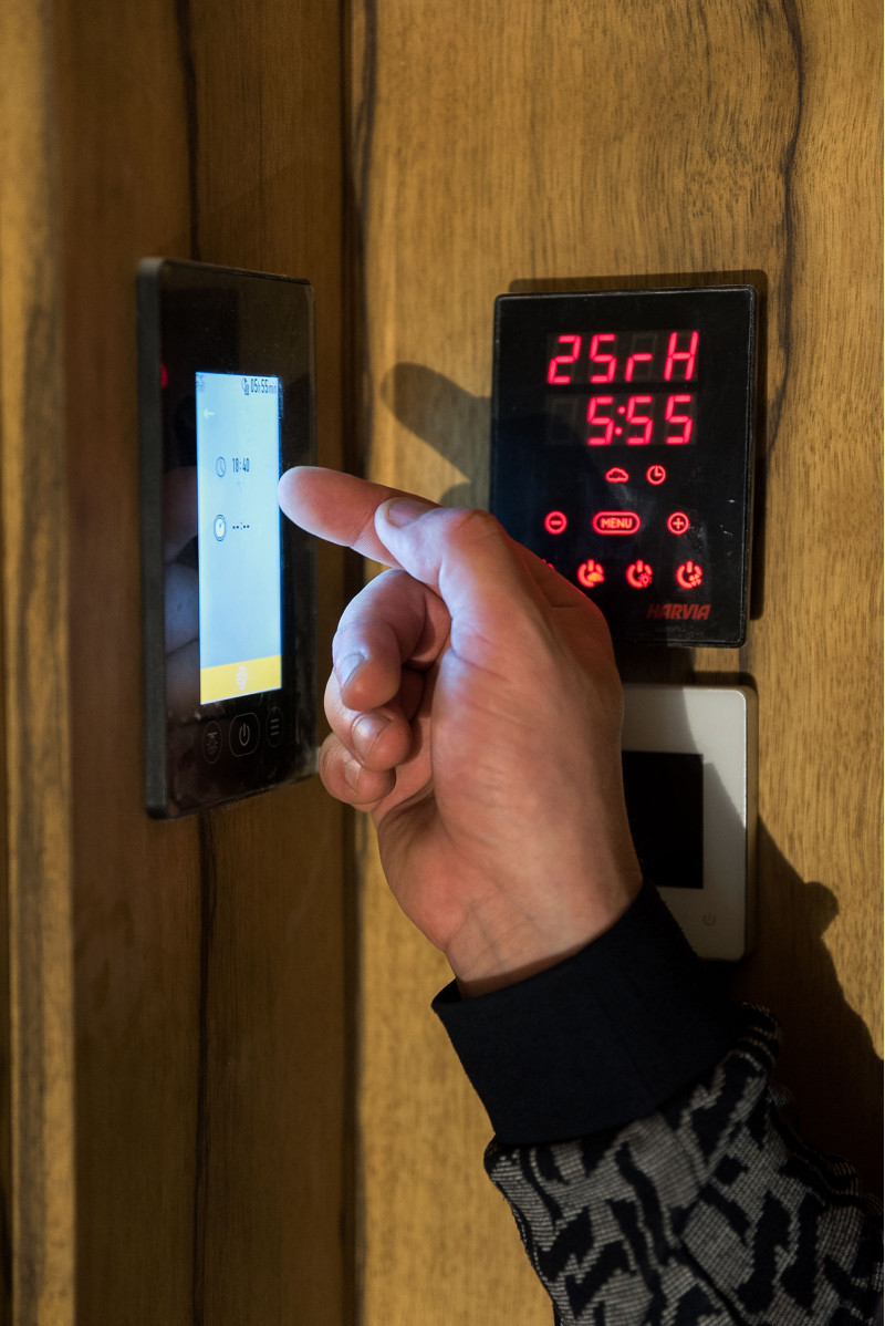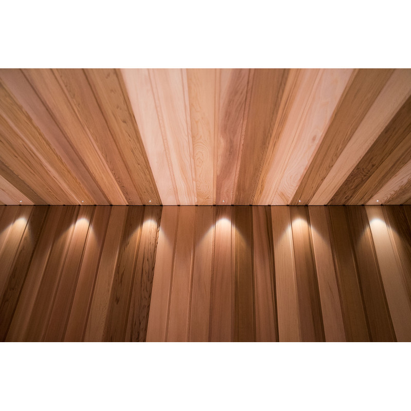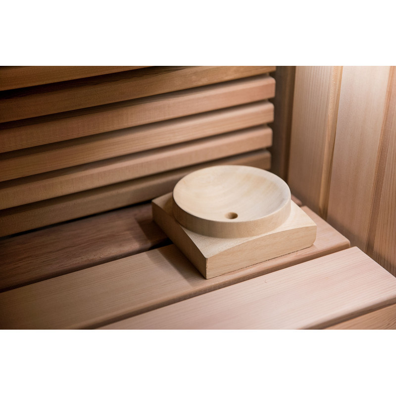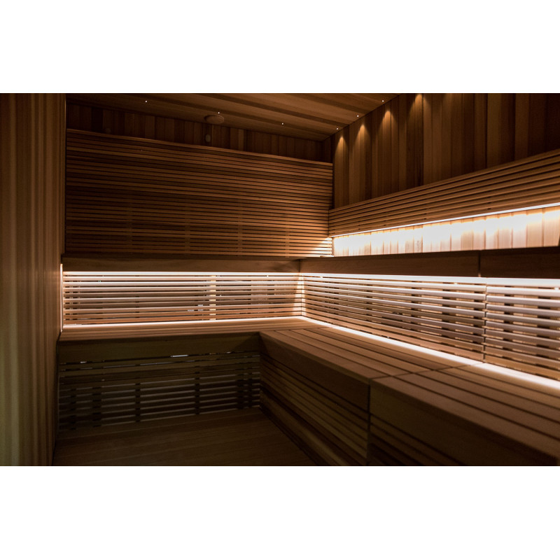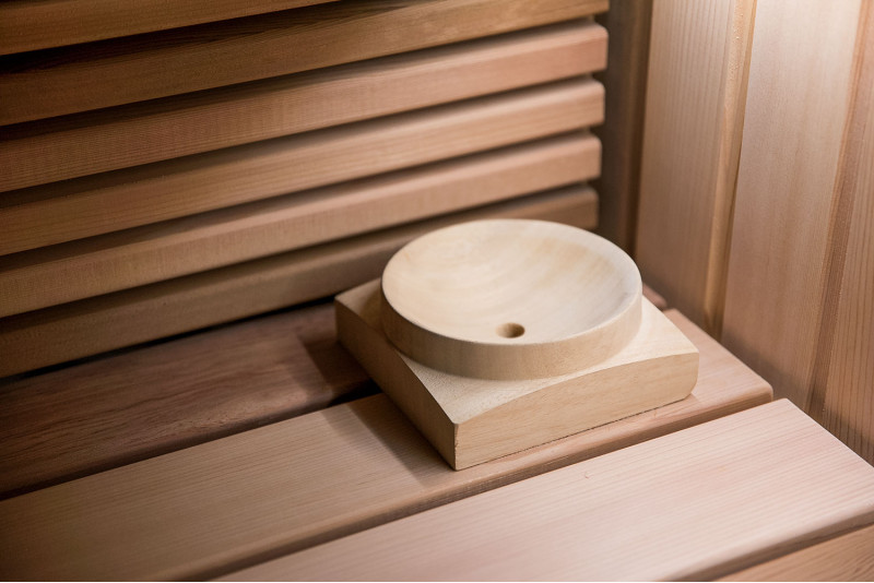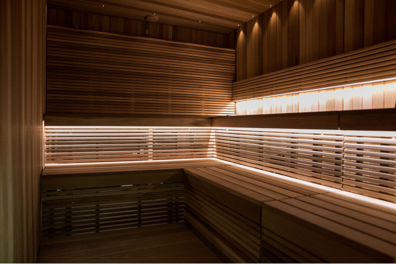 Saunai pasirinkta itin graži mediena - raudonasis Kanados kedras. Tai ypač atsparus ir ilgaamžis medis, išskiriantis natūralius eterinius aliejus, kurie pirtyje skleidžia išskirtinį kvapą. Pasižymi dezinfekuojančiomis, antibakterinėmis savybėmis, natūraliai priešinasi drėgmei. Ažūriniai medžio briuseliai apšviesti LED sistema, lubose sumontuotas šviesolaidinio apšvietimo rinkinys Cariitti. Po gultais sumontuota EOS Bi-O Mat krosnelė su integruotu garo garintuvu, valdoma Harvia Xenio Combi CX110C valdymo pultu.