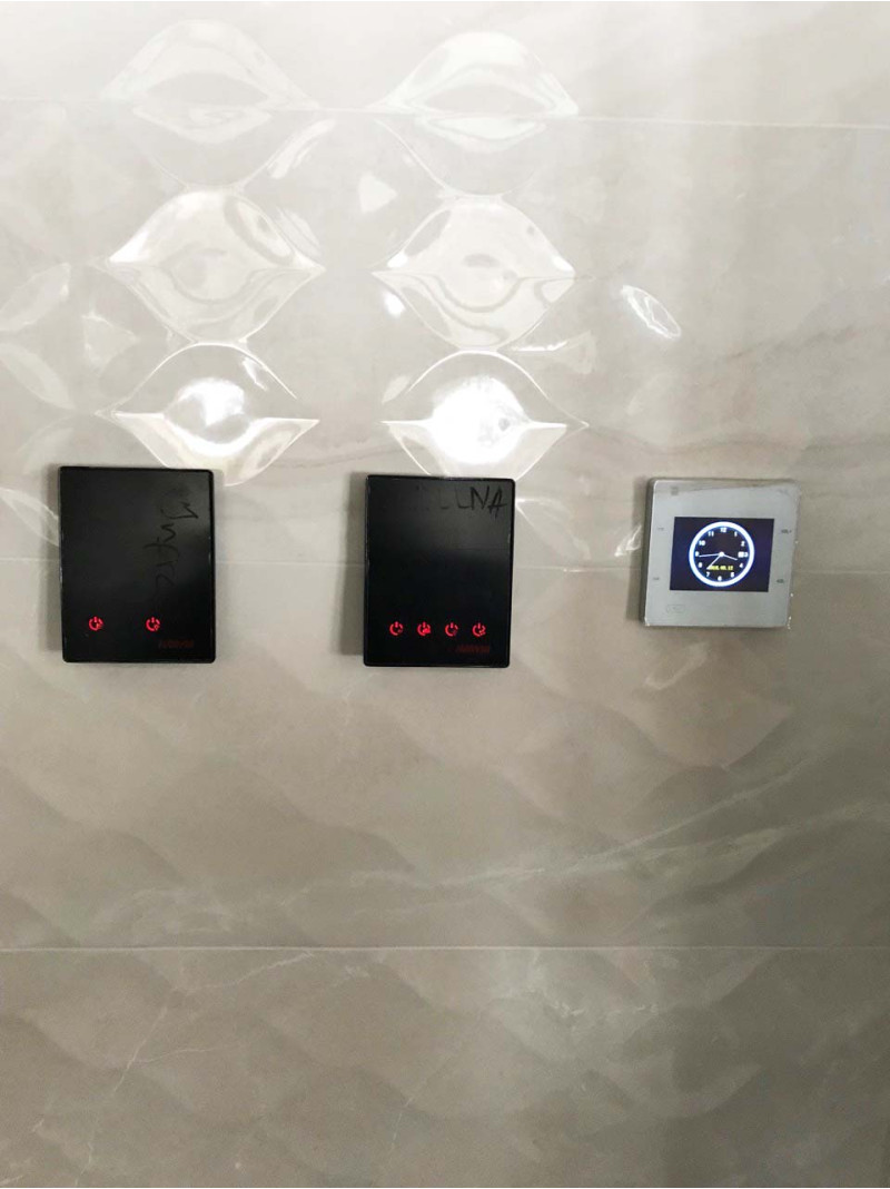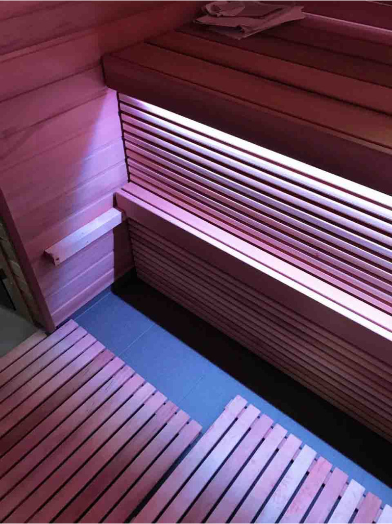 - Šviestuvas Led RGB po viršutiniu gultu, nugaros atramose ir už druskų sienos - spalvos valdomos atskiru pulteliu.