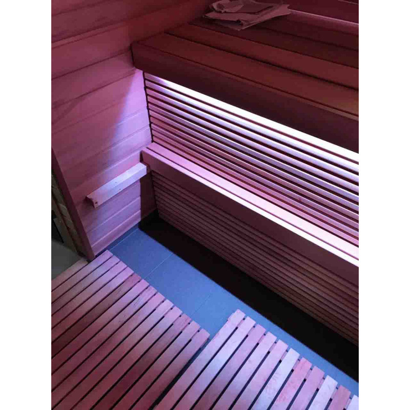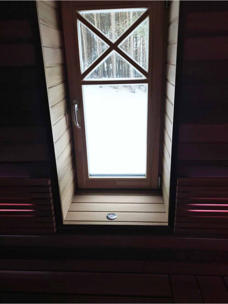 - Vidaus apdaila ir gultai iš aukščiausios kokybės kedro medienos - nedeginančios kūno. Gultai iš nestandartinių platesnių lentų - patogesniam vanojimui. Nugaros atramos ir krosnelės aptvaro apsauga - abachi juostelės.