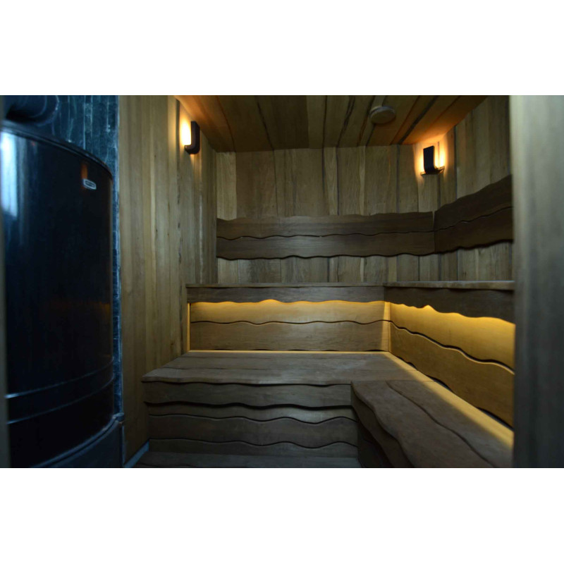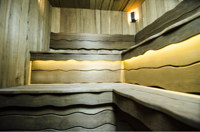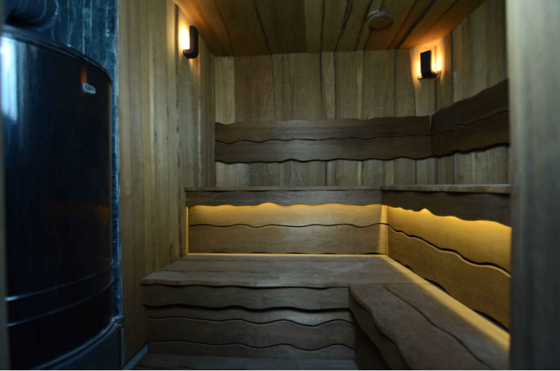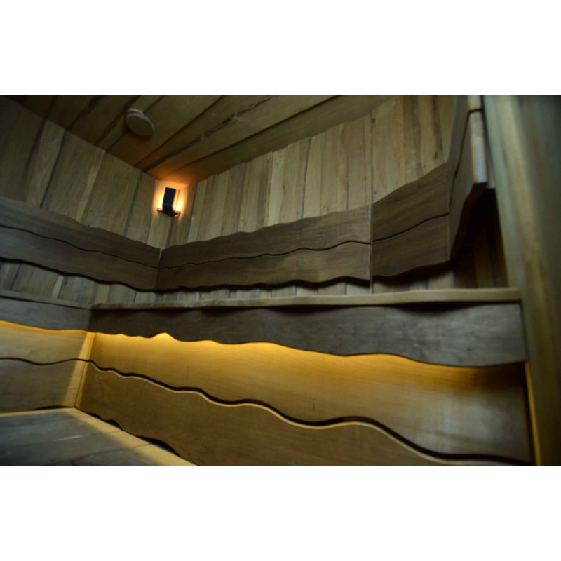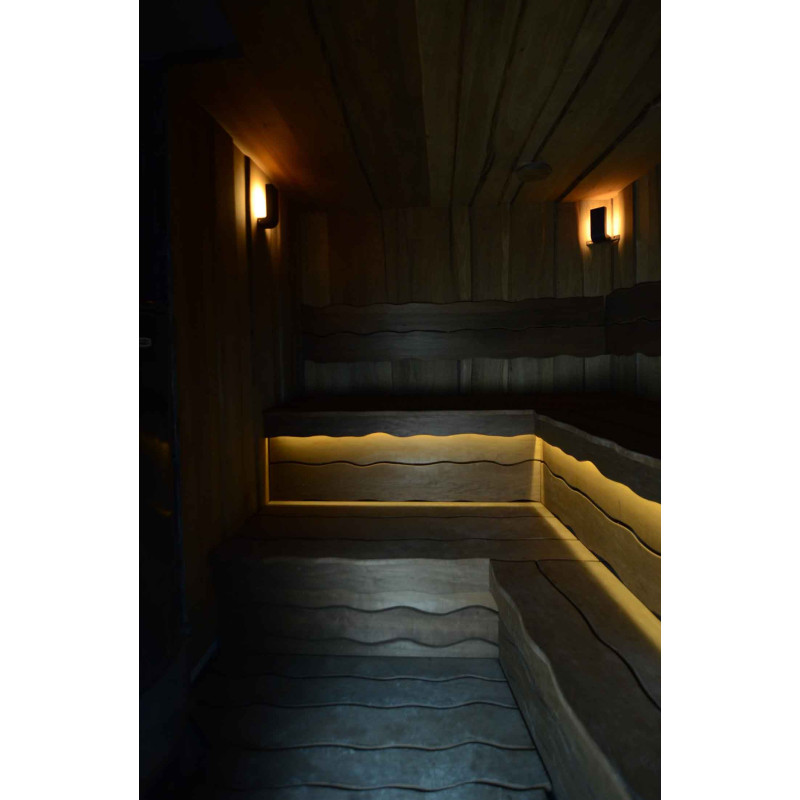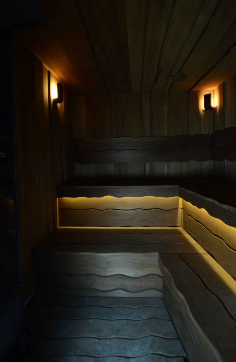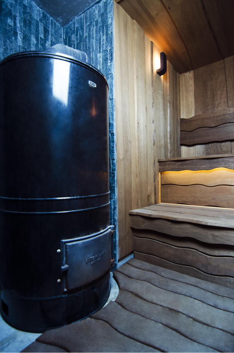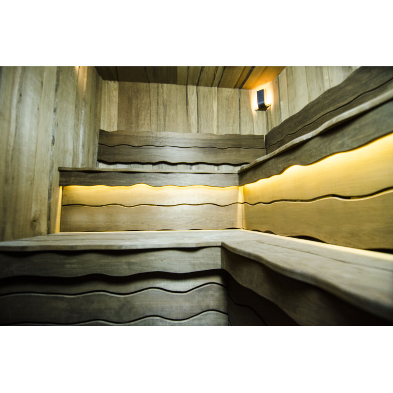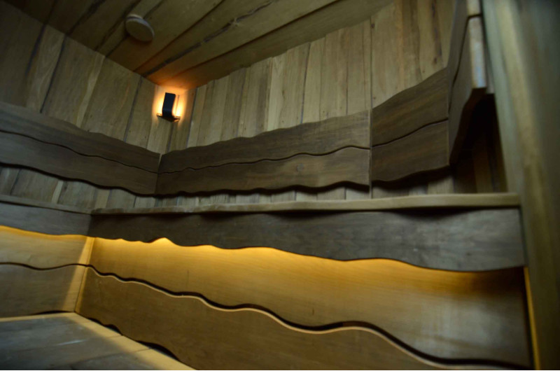 Pirties sienų ir lubų apdailai bei gultams ir nugaros atramoms naudota degintos drebulės mediena. Pasirinktos obliuotos viengubo pjovimo lentos, suteikiančios pirčiai jaukumo ir natūralumo.