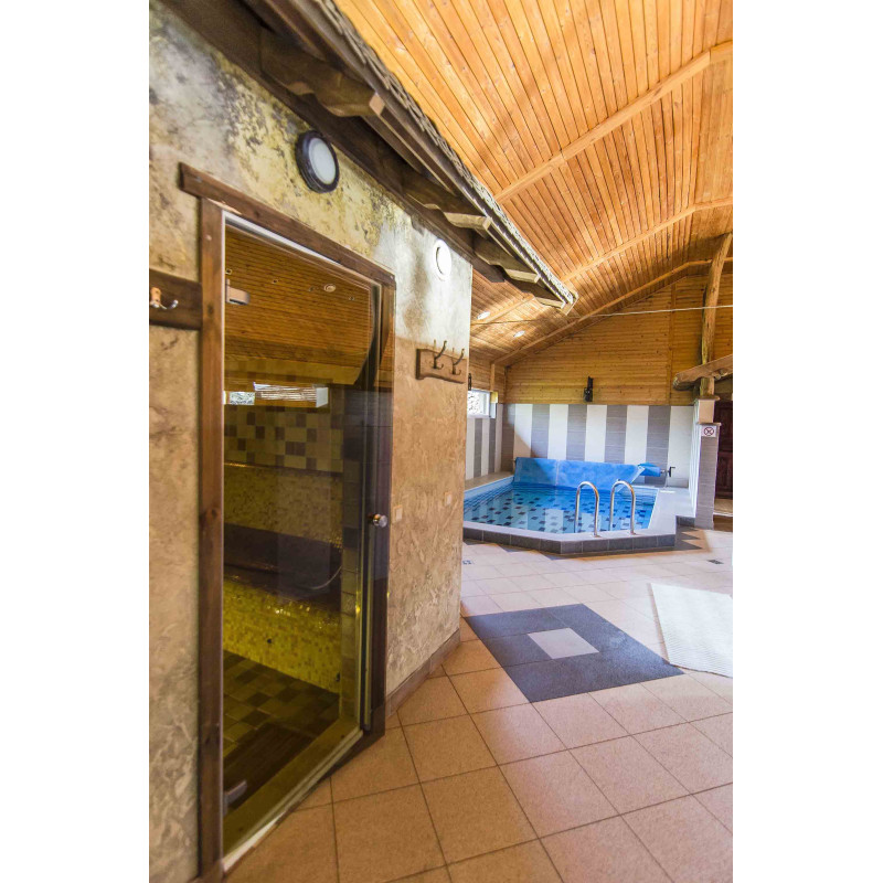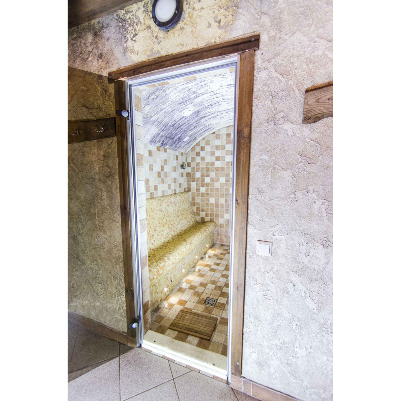 Senos medinės staktos durys buvo pakeistos į tinkamas garinei pirčiai - su aliuminio stakta, tonuotu, grūdintu stiklu. Tokio tipo durys ir stakta yra atsparios karščiui ir drėgmei, temperatūros svyravimams, neišsikraipo.