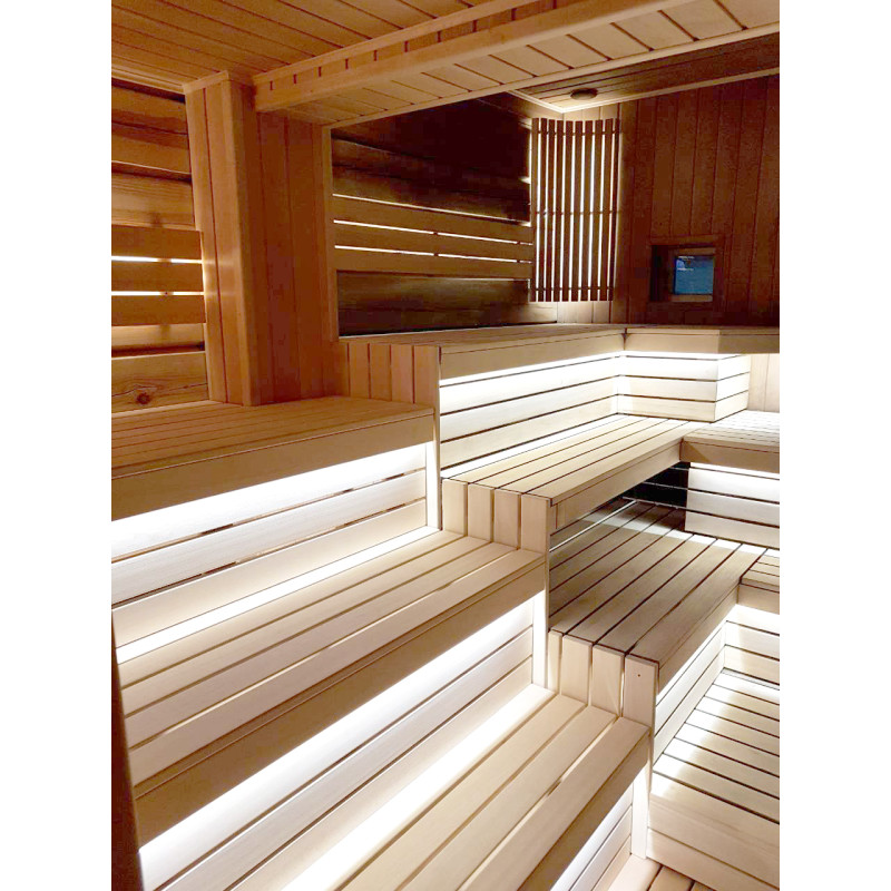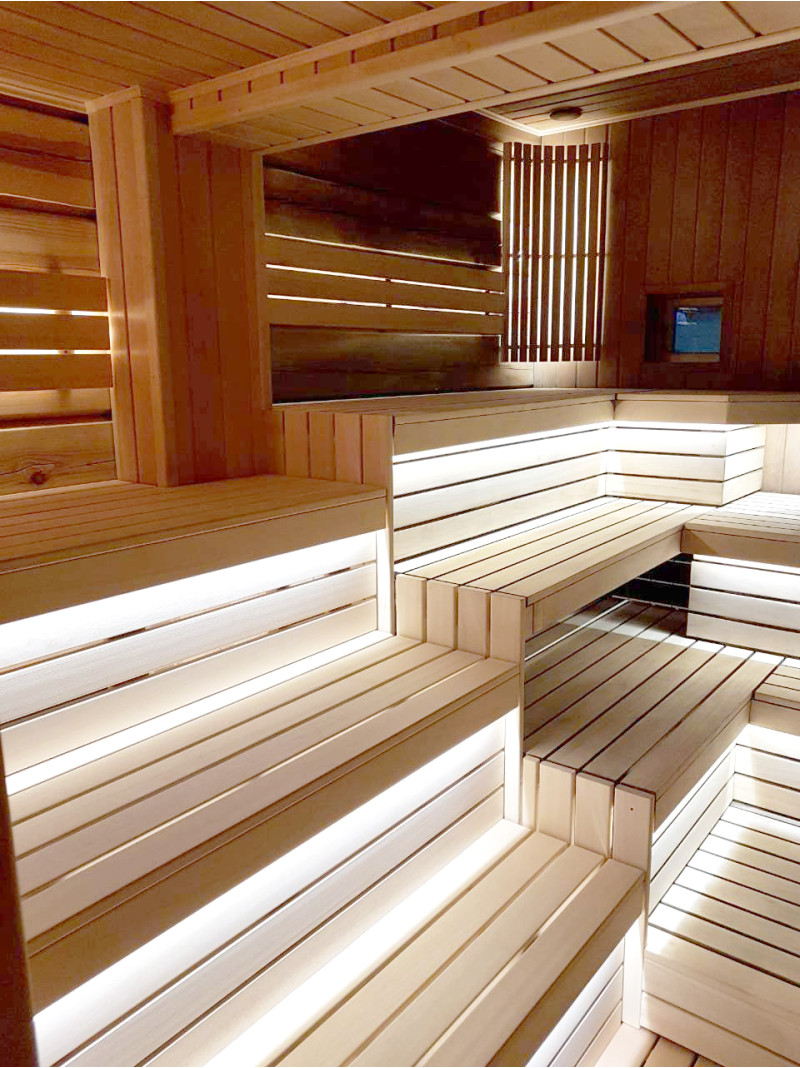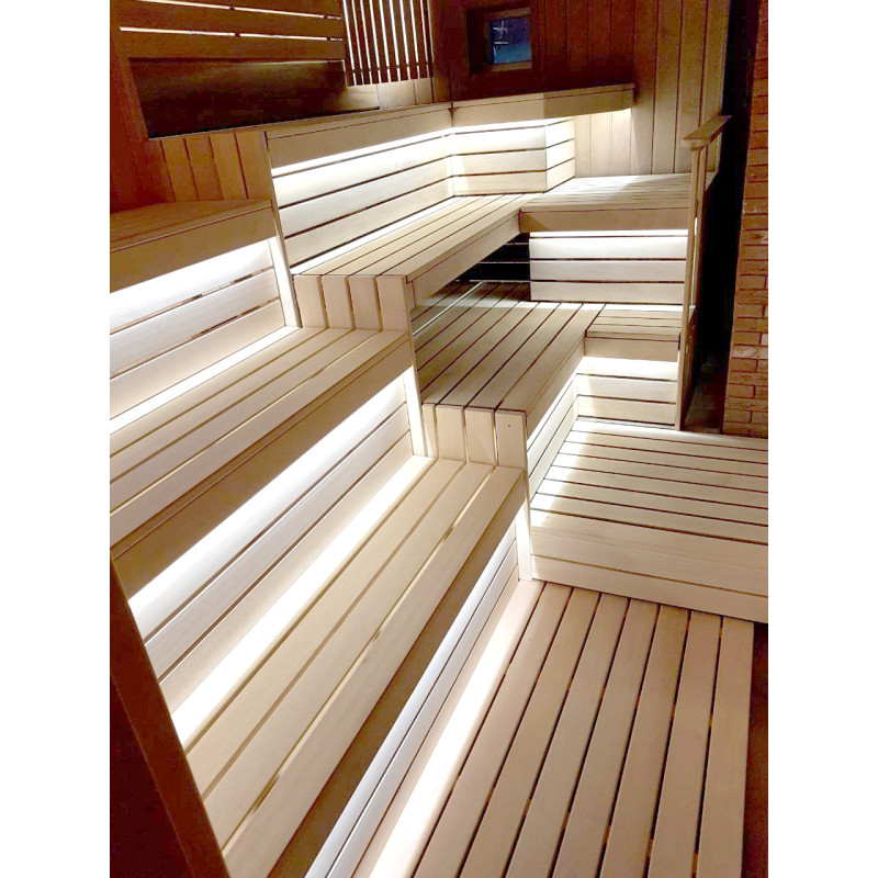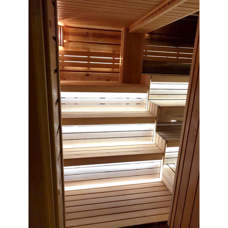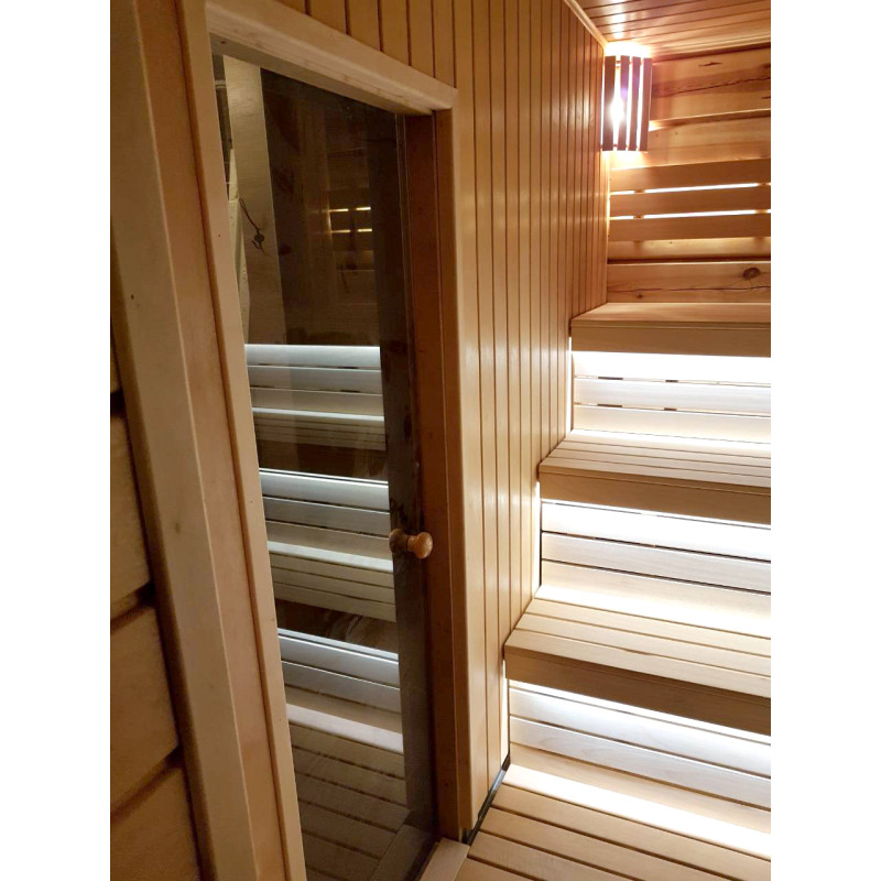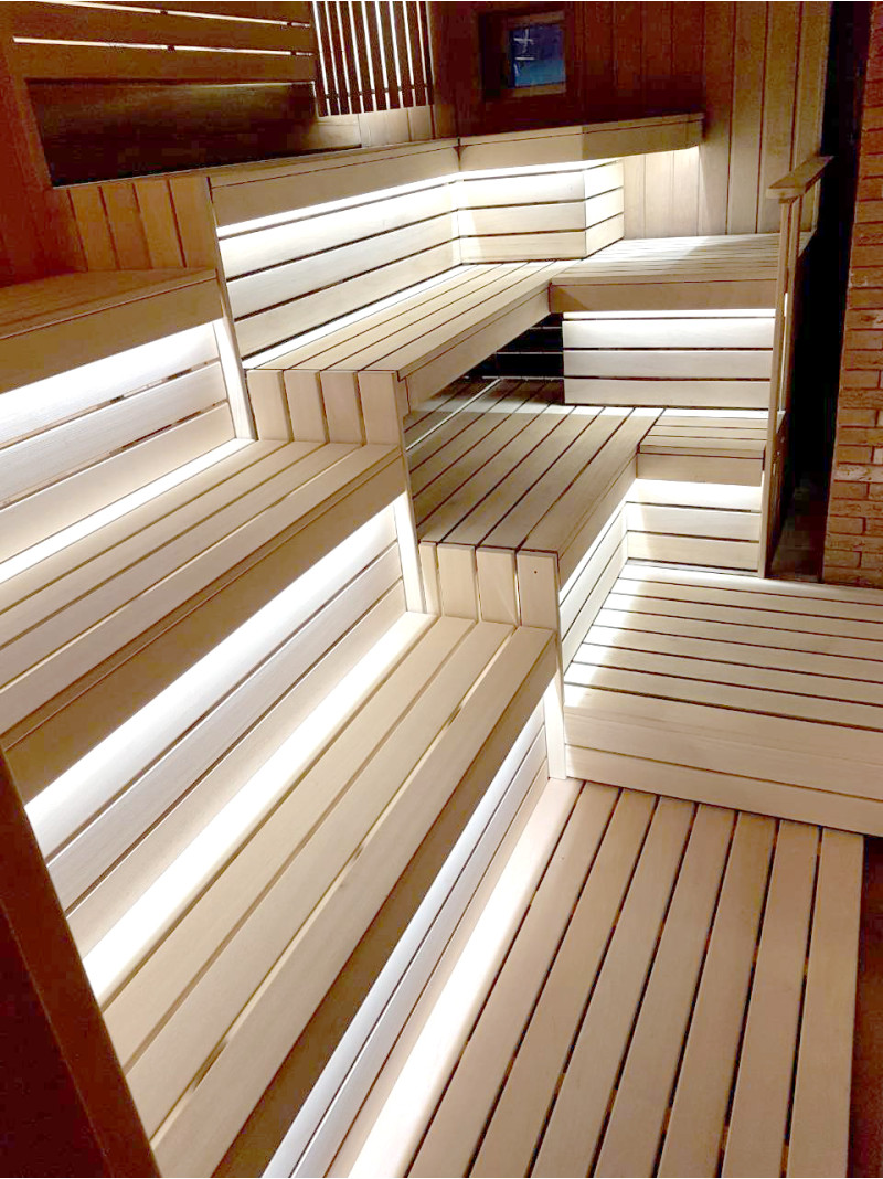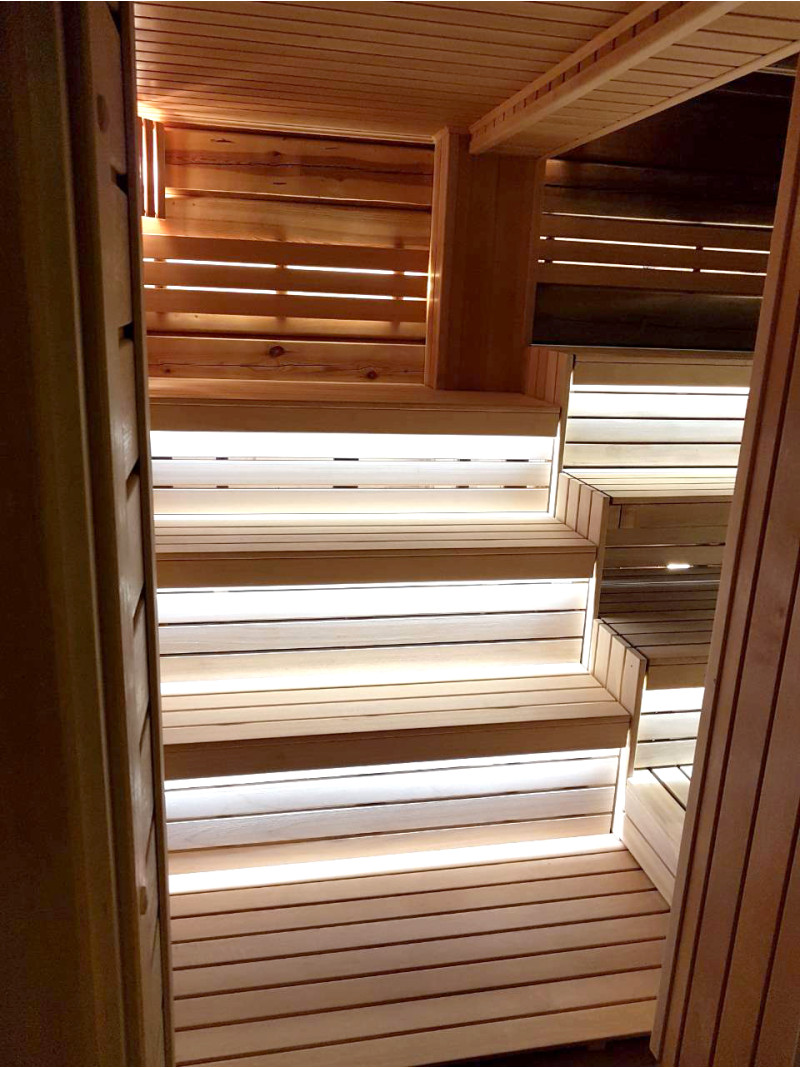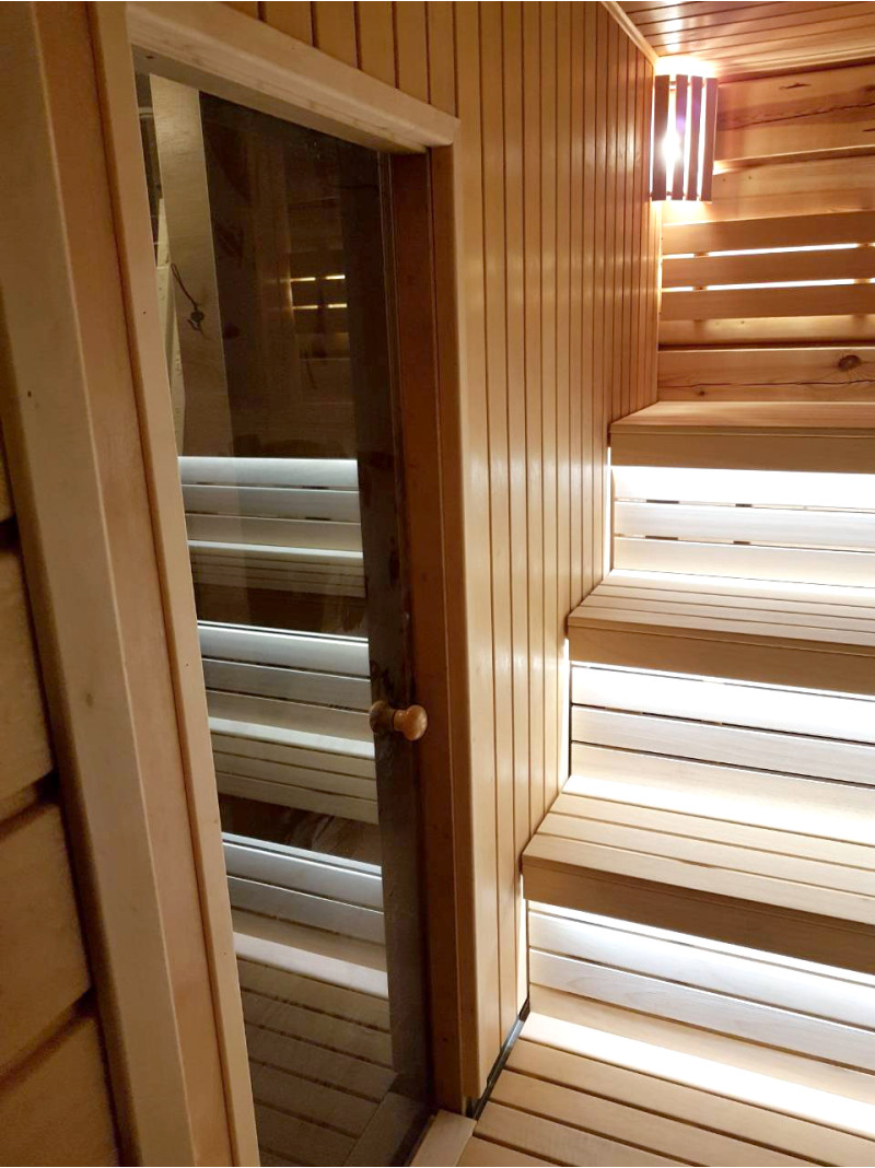 Po gultais įrengtas šiltos baltos spalvos LED apšvietimas, suteikiantis pirtelei erdvumo ir jaukumo jausmą. Sienos apšvietimui pasirinktas šviestuvas su derančiu mediniu gaubtu.