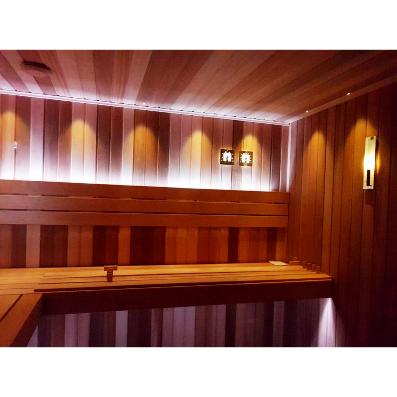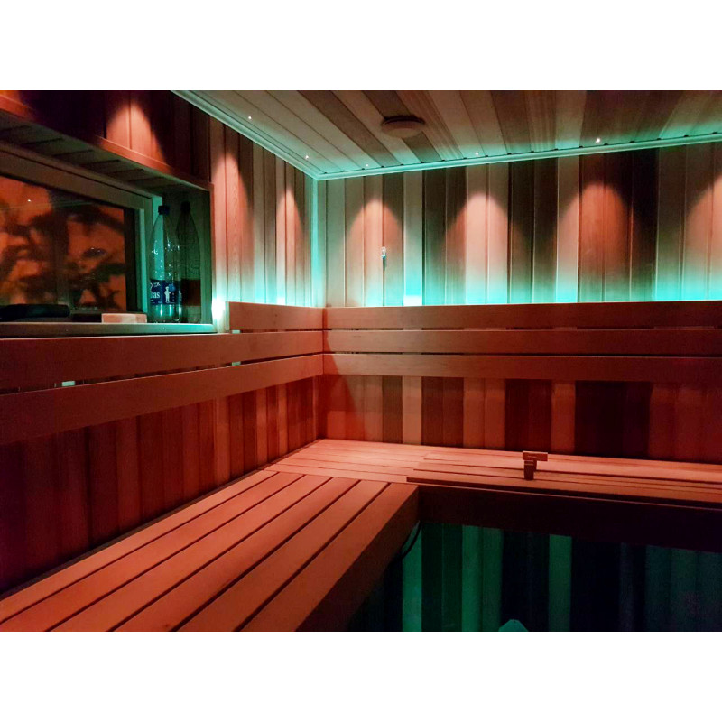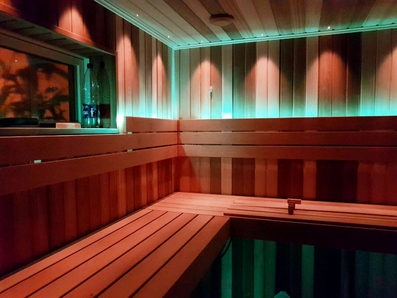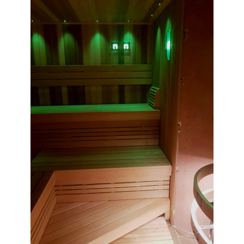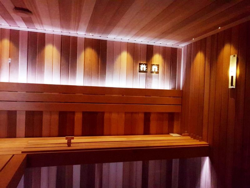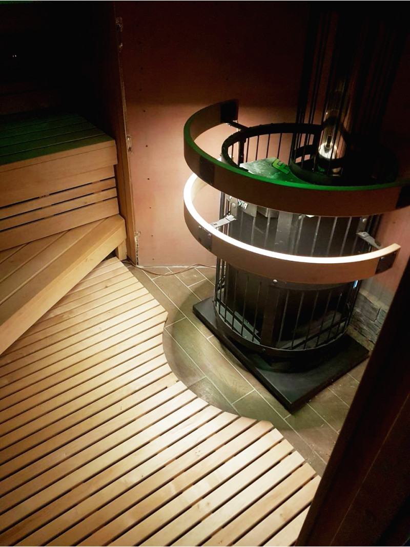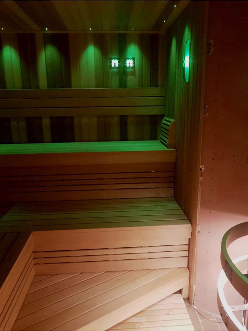 Stilingam pirties apšvietimui pasirinkta: Cariitti šviesolaidinis apšvietimo projektorius, šviestuvai po nugaros atramomis, gultais ir apšviesti termometrai. Šviestuvai gali keisti spalvas – priklausomai nuo Jūsų norų ir nuotaikos.
