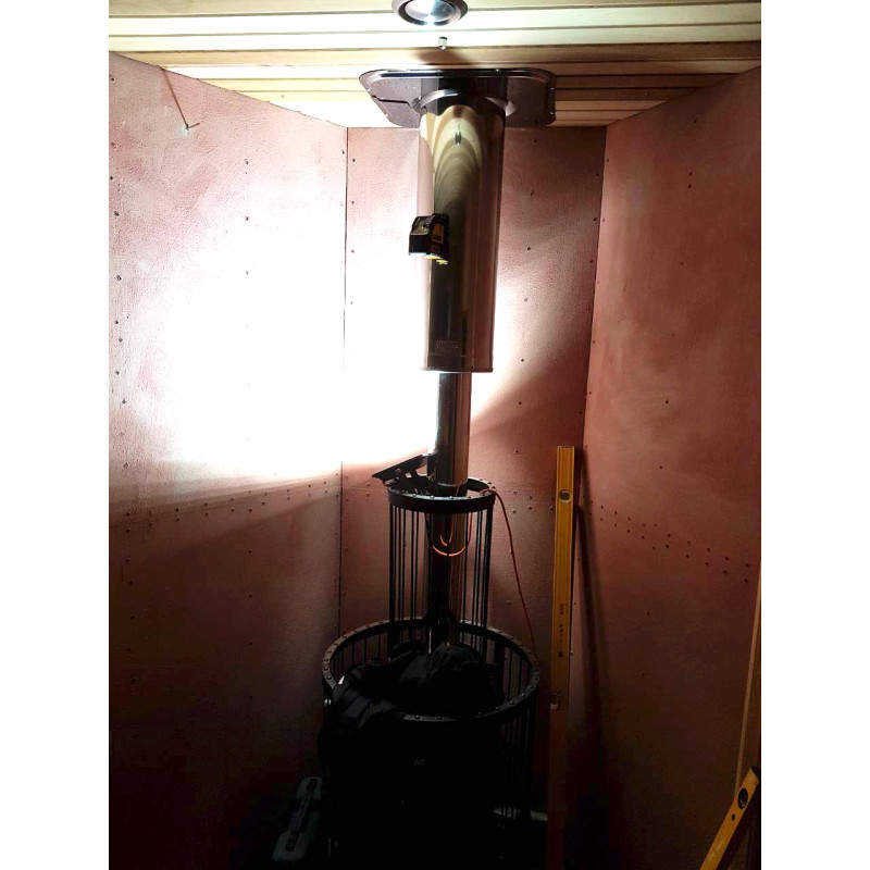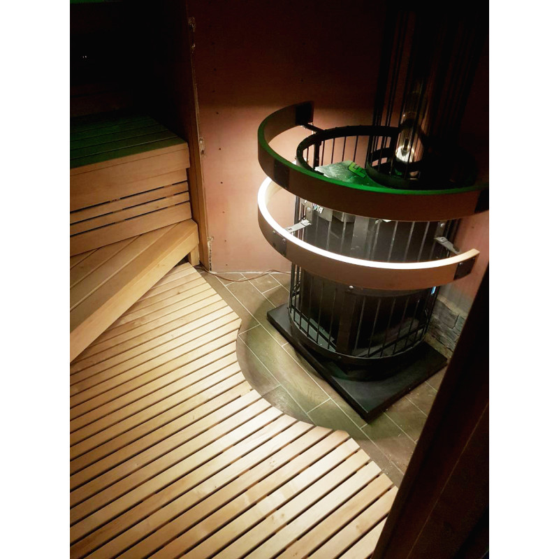 Vidutinio dydžio pirčiai parinkta malkinė Harvia Legend 240 DUO krosnelė su išorine pakura, ketaus durelėmis ir stiklo langeliu, užpildyta dideliu kiekiu muilo akmenų, kurie leidžia mėgautis jų skleidžiama šiluma net ir nesant aukštai temperatūrai. Krosnelės aptvarai - Harvia Legend su apšvietimu.