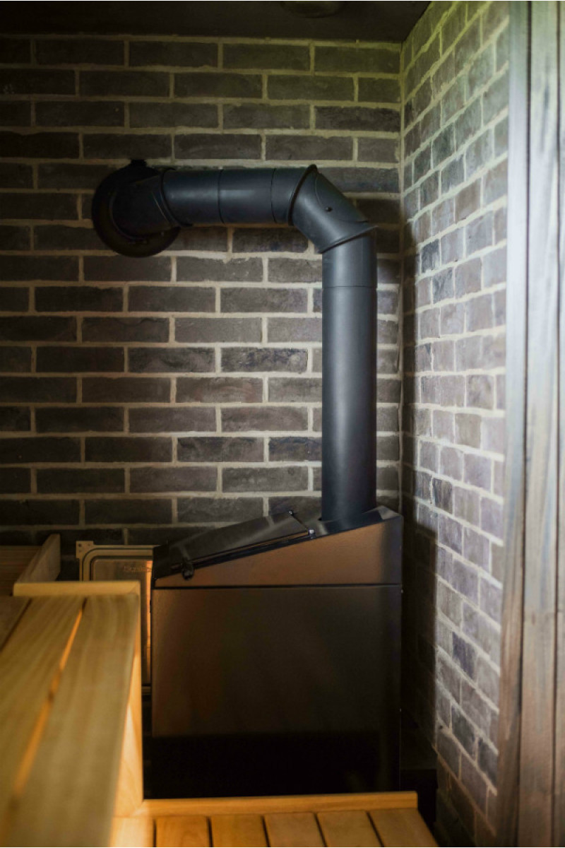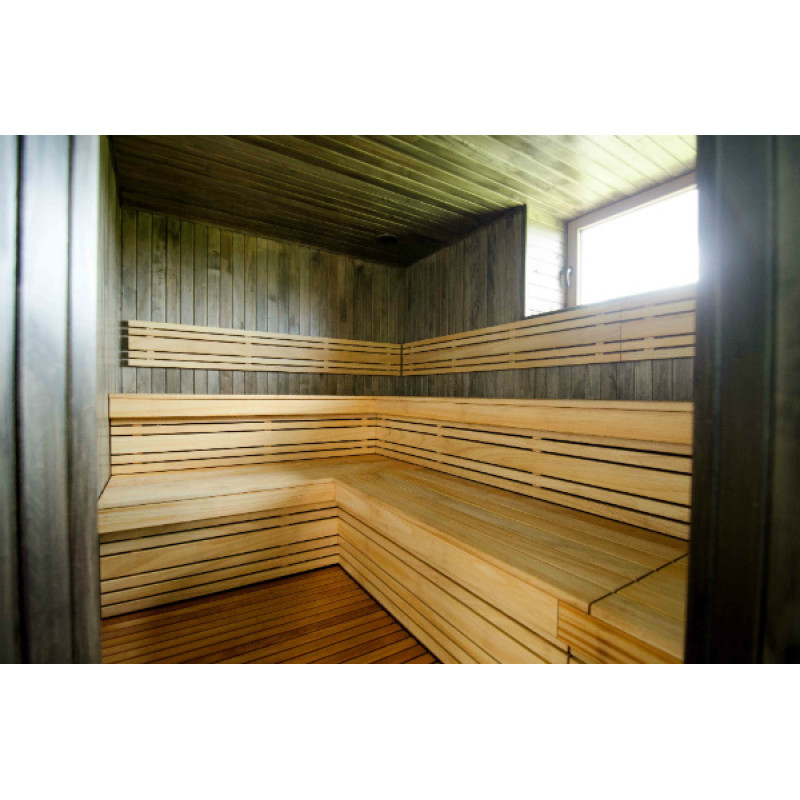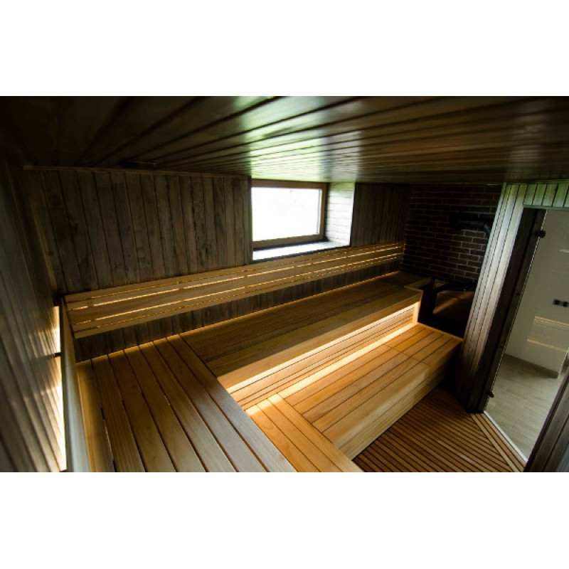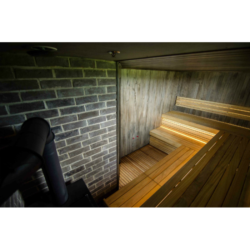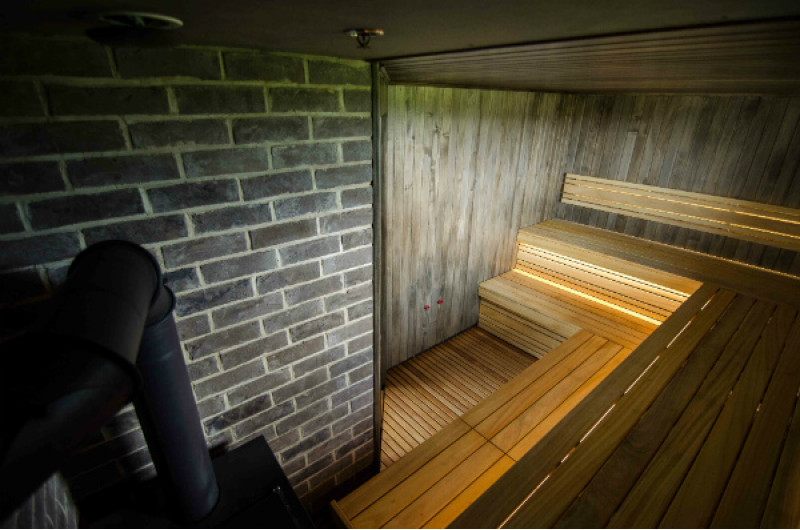 Sienos ir lubos, vaškuotos specialiu juodos spalvos vašku, sukuria kontrastą su šviesiais pirties gultais, patalpa atrodo unikaliai, sukuriama jauki ir moderni atmosfera. Šį gultų ir sienų kontrastą dar labiau paryškina įrengtas temperatūrai ir drėgmei atsparus baltos spalvos LED apšvietimas po gultais ir nugaros atramomis.