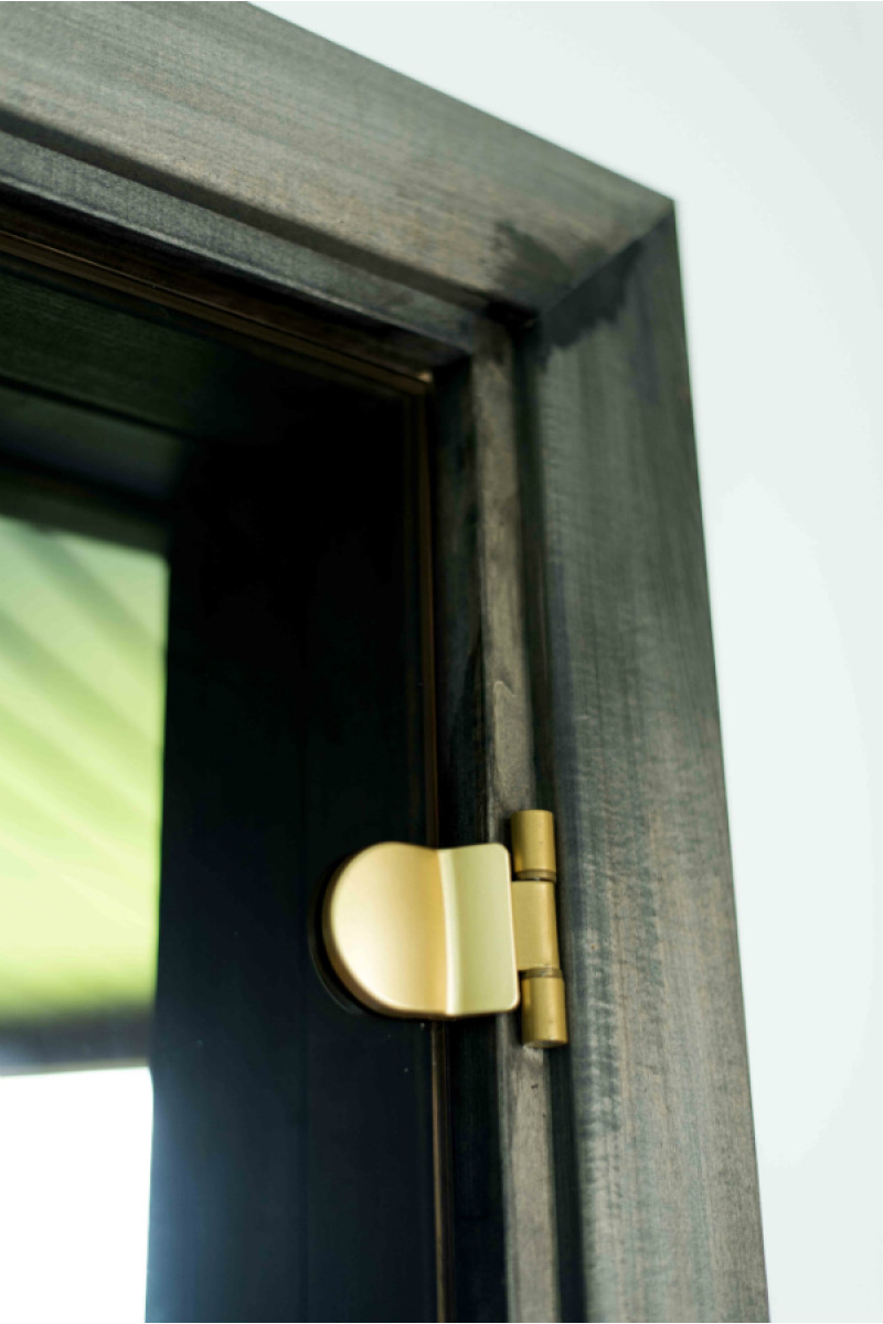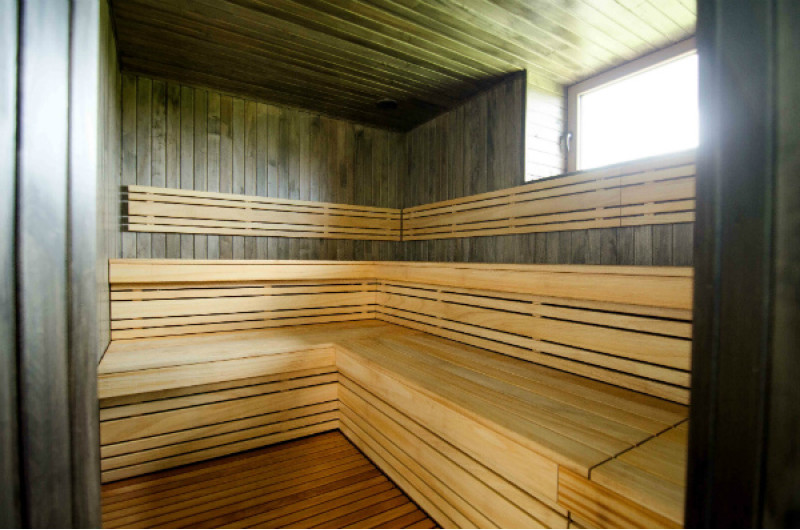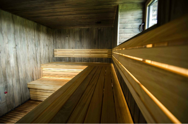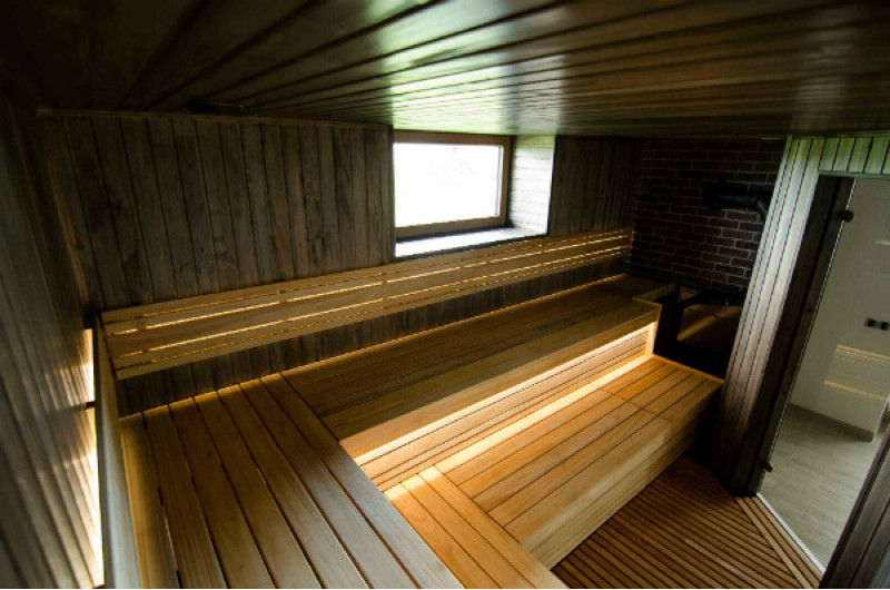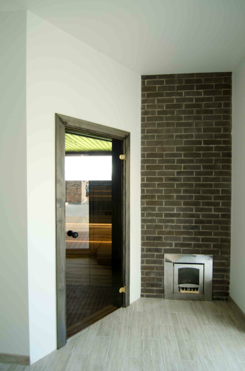 Sienos ir lubos, vaškuotos specialiu juodos spalvos vašku, sukuria kontrastą su šviesiais pirties gultais, patalpa atrodo unikaliai, sukuriama jauki ir moderni atmosfera. Šį gultų ir sienų kontrastą dar labiau paryškina įrengtas temperatūrai ir drėgmei atsparus baltos spalvos LED apšvietimas po gultais ir nugaros atramomis.