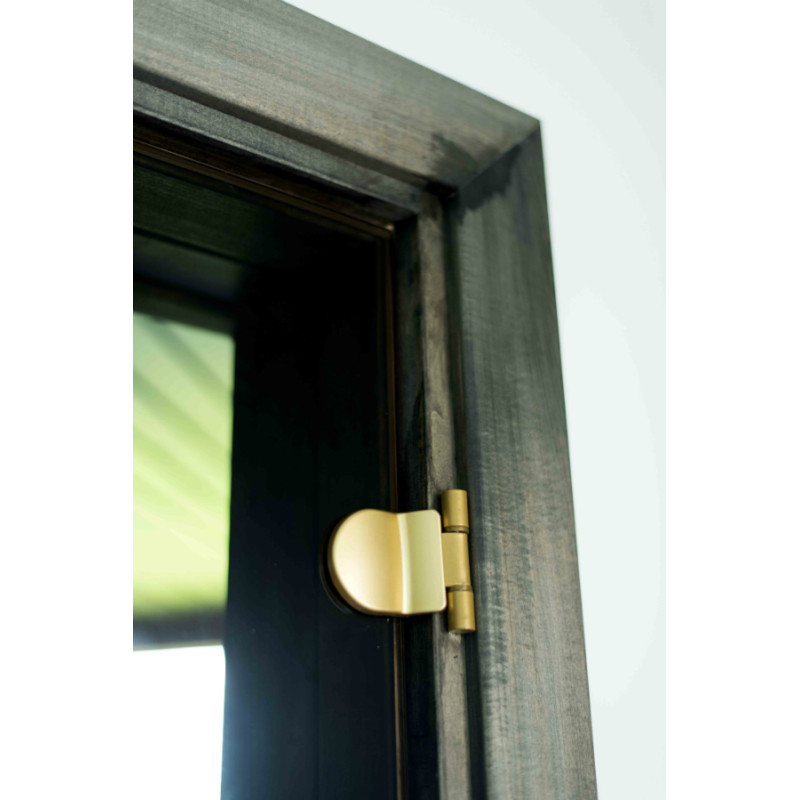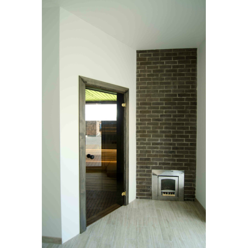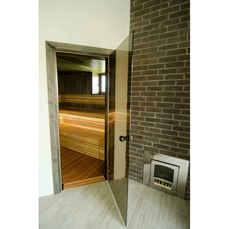 Durys su tonuotu grūdintu bronzinės spalvos stiklu, liepos medienos rėmu ir apvalia rankena.