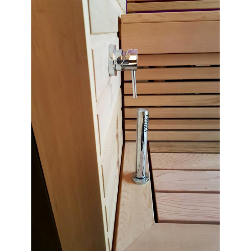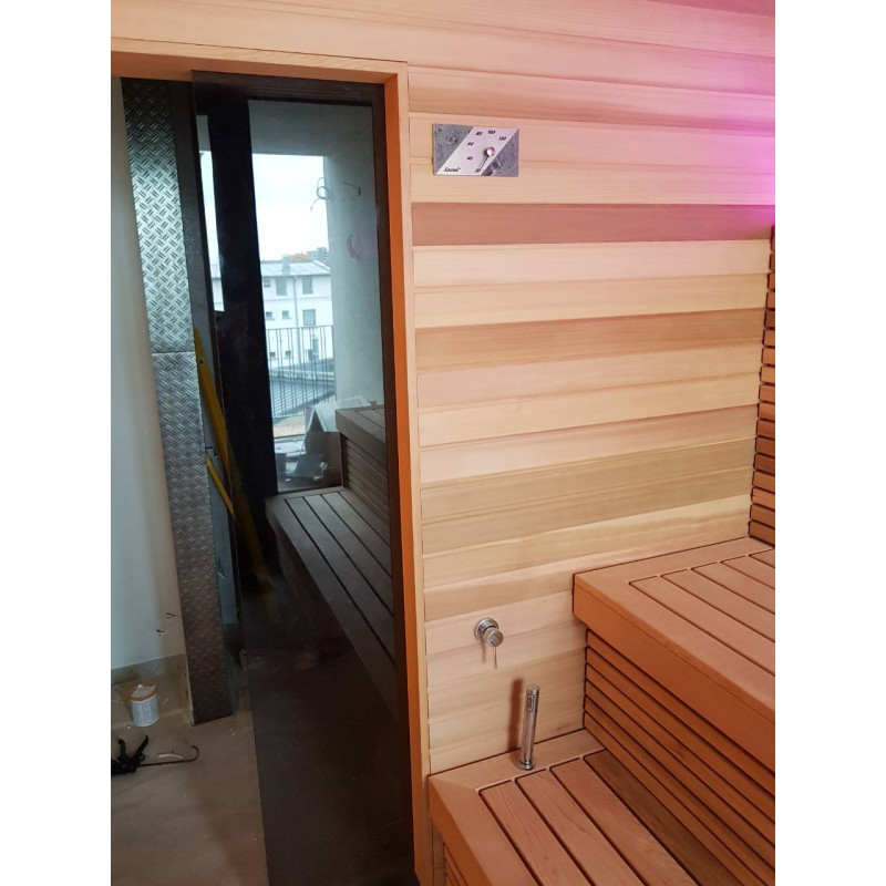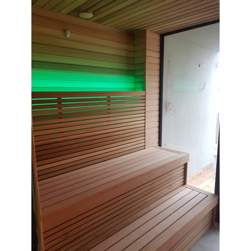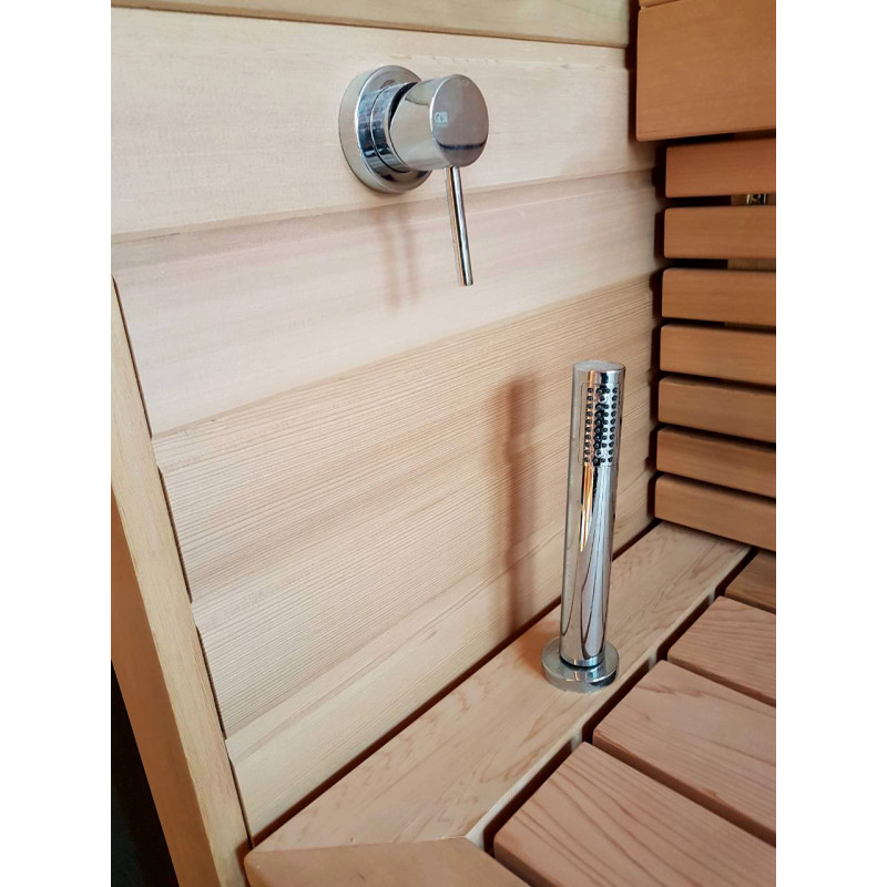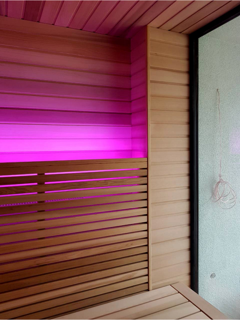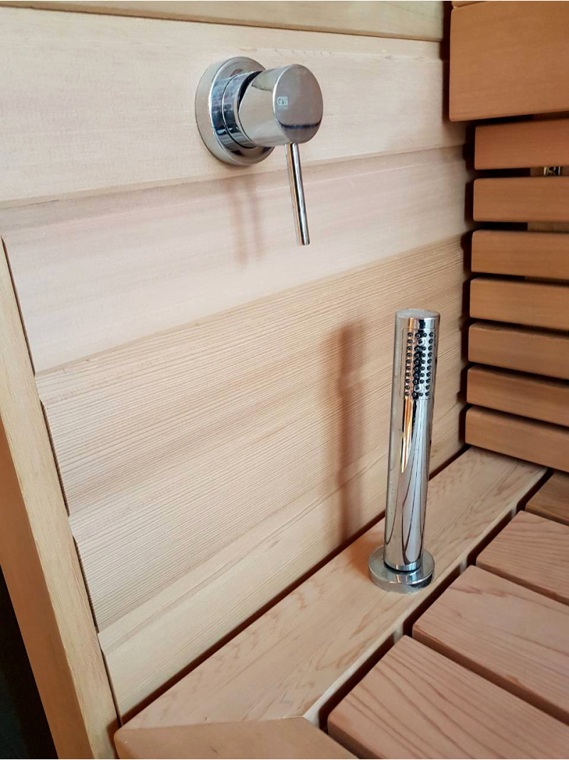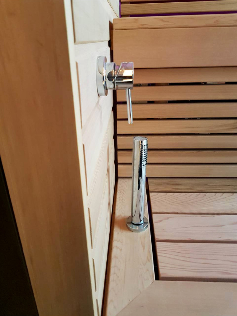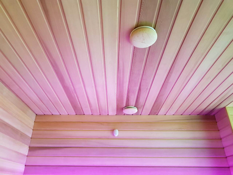 Pirtyje įrengti garsiakalbiai, atsparūs karščiui ir drėgmei.
