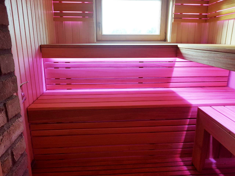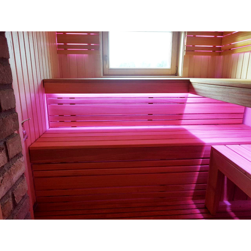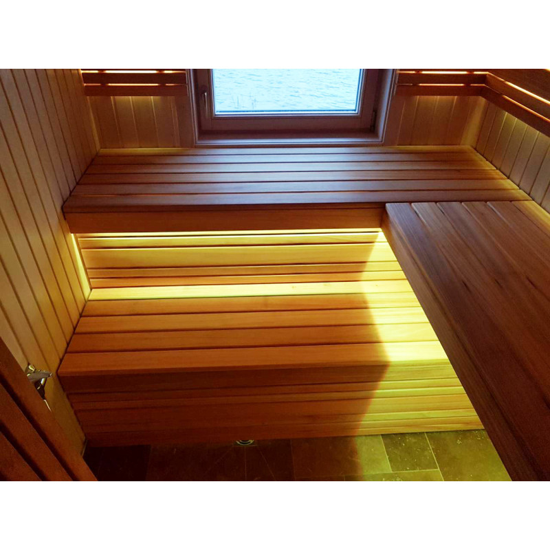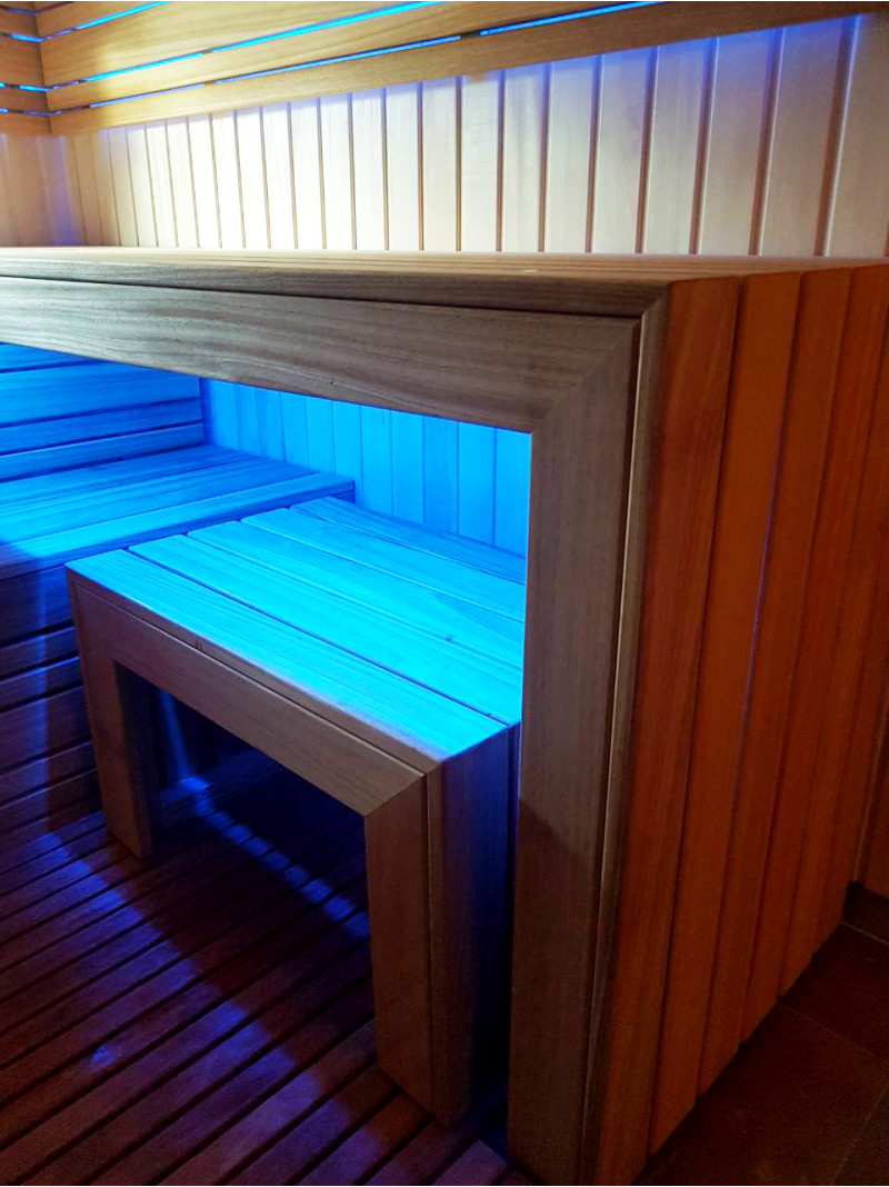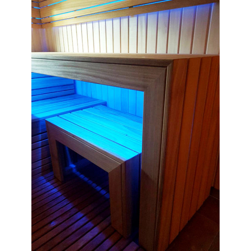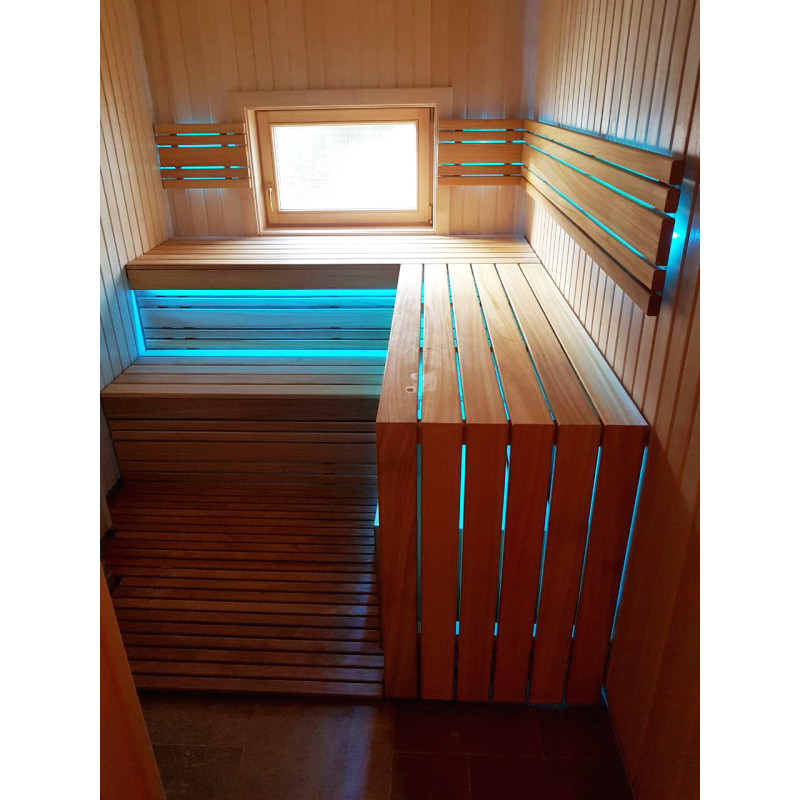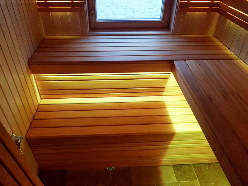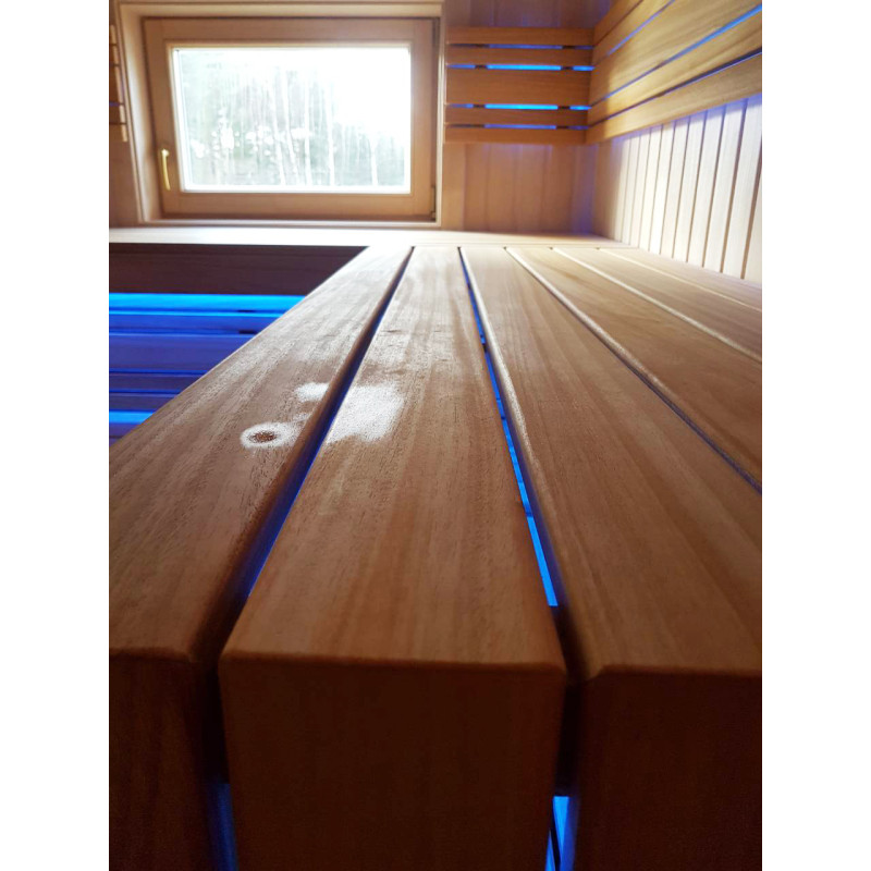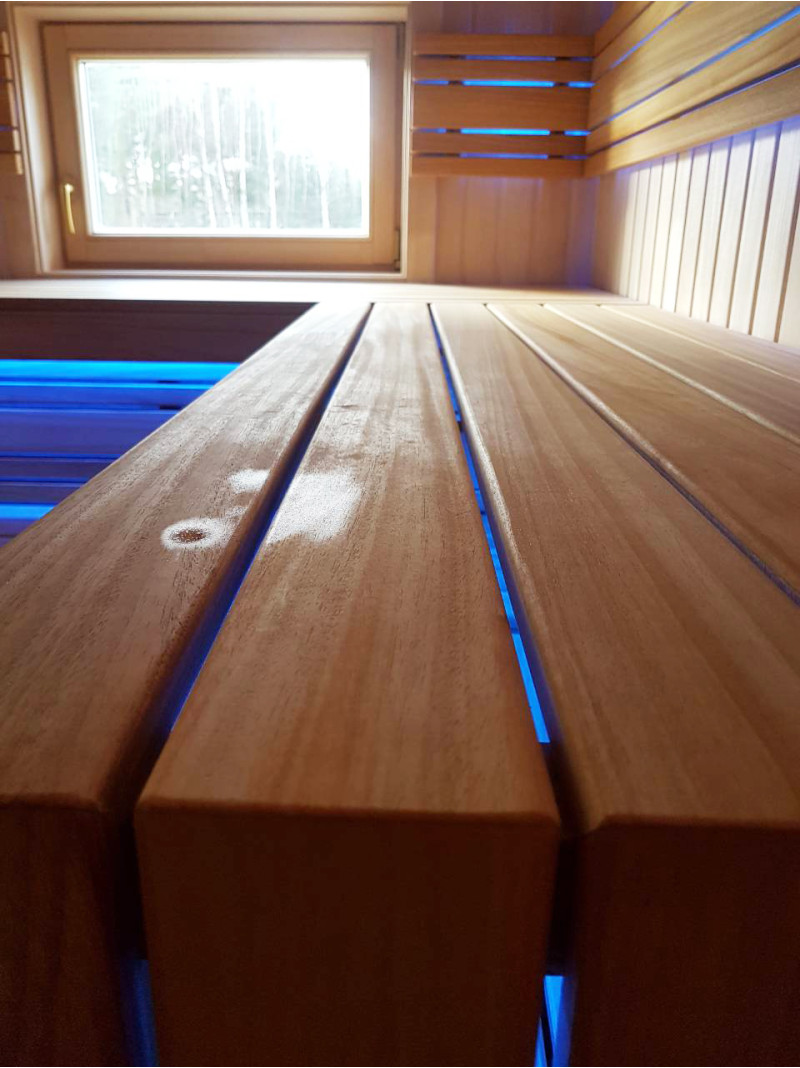 Pirties vidaus medinės detalės ir gultai - afrikinė abachi mediena. Ši mediena savo struktūros dėka yra minkšta ir labai mažai kaistanti, todėl labai tinka pirties gultams montuoti.