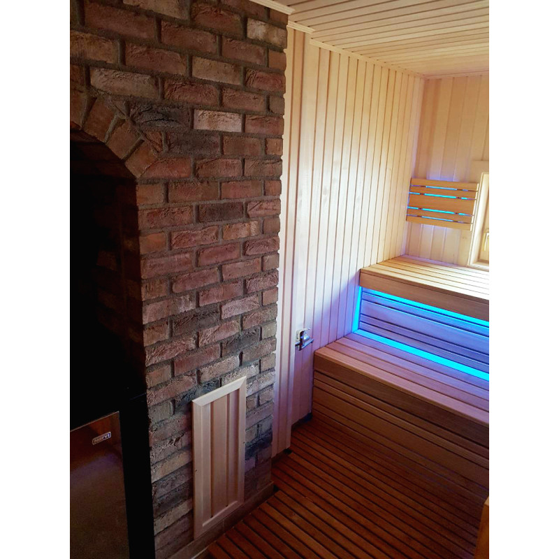 Pirtyje taip pat yra langas, suteikiantis pirčiai daugiau šviesos ir erdvumo.