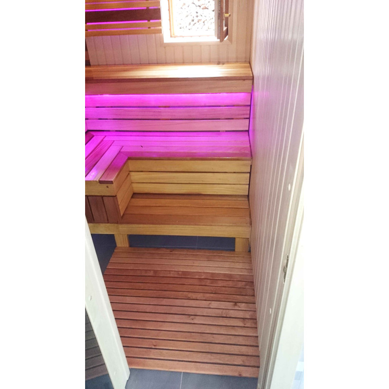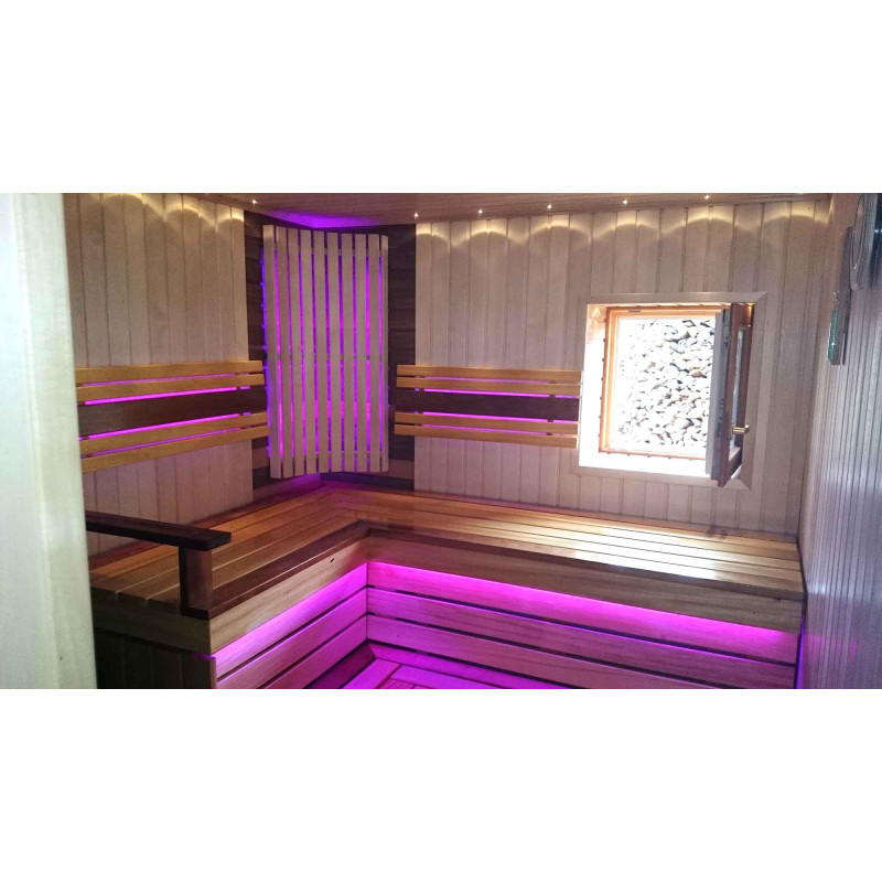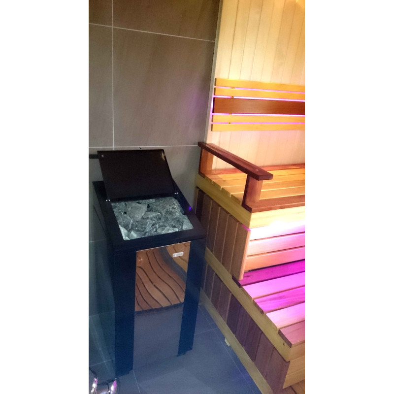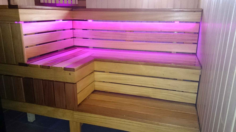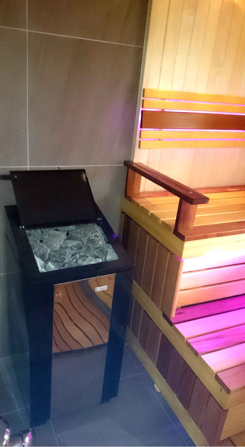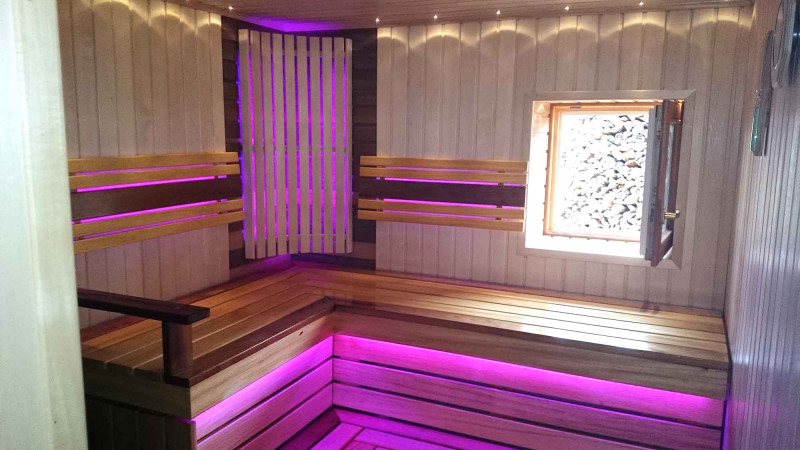 Saunai įrengta ventiliacijos sistema. Sumontuotas spalvotas apšvietimas po gultais ir už nugaros atramų, kuriantis jaukią, raminančią aplinką. Pakabintas šviestuvas Harvia su abachi medienos gaubtu. Termometras ir higrometras Harvia, dviejų skalių.