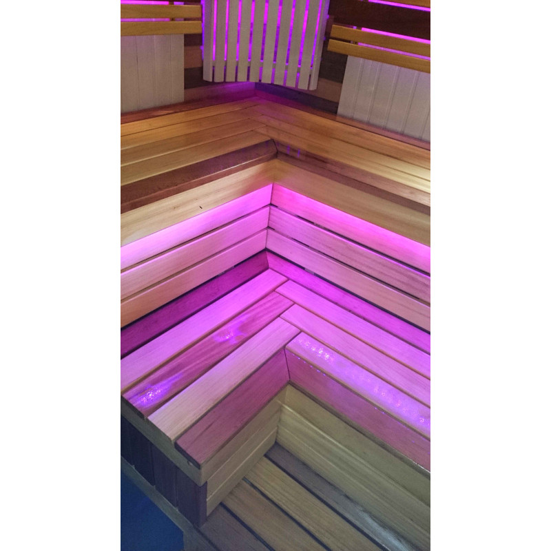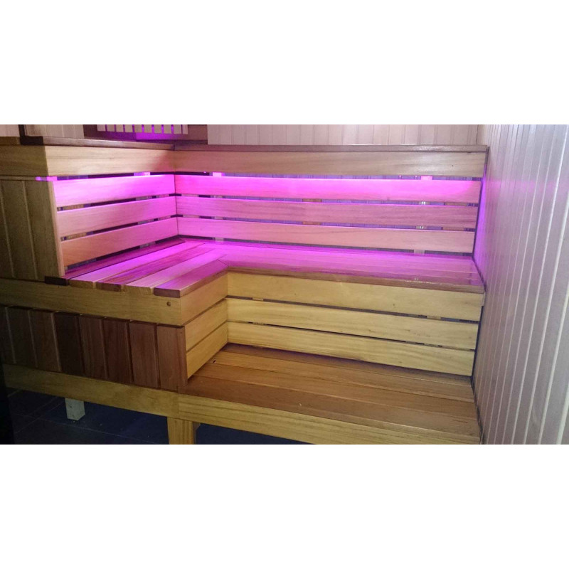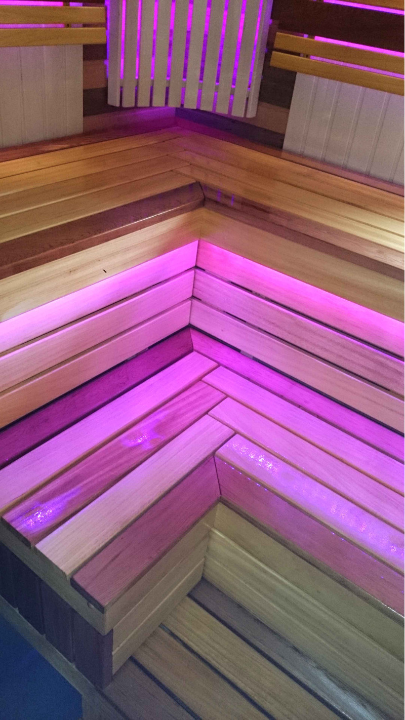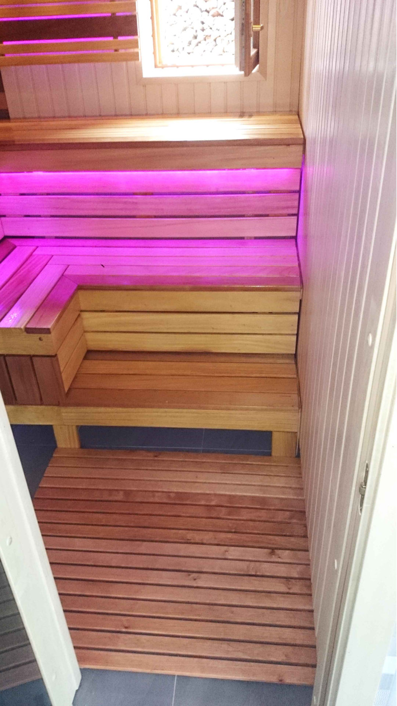 Saunai įrengta ventiliacijos sistema. Sumontuotas spalvotas apšvietimas po gultais ir už nugaros atramų, kuriantis jaukią, raminančią aplinką. Pakabintas šviestuvas Harvia su abachi medienos gaubtu. Termometras ir higrometras Harvia, dviejų skalių.
