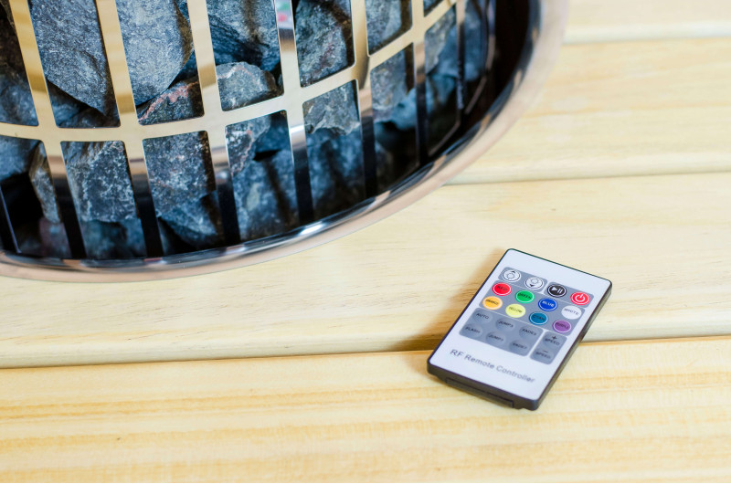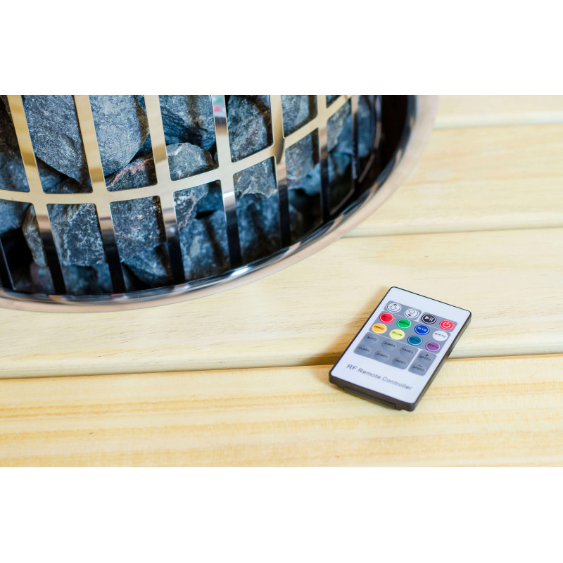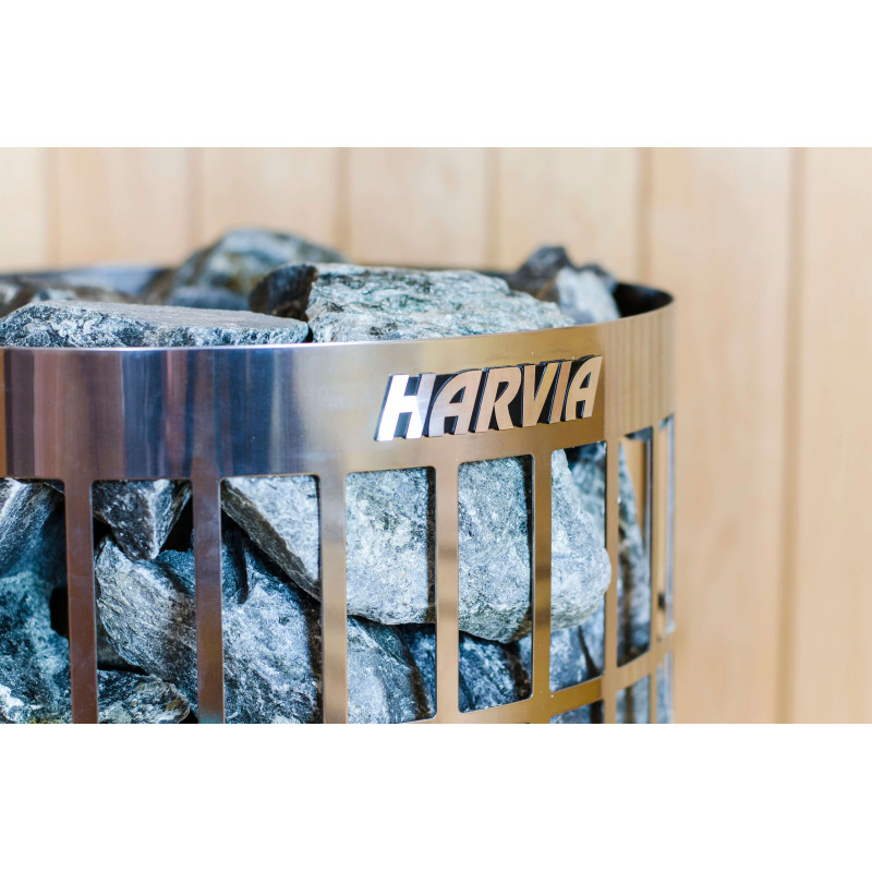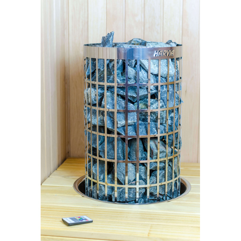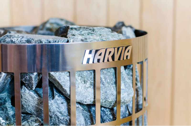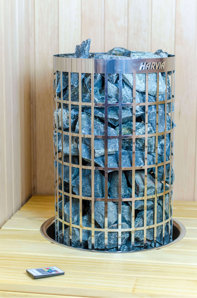 Krosnelė - Harvia Cilindro su apdailos žiedu, užpildyta gabro diabazo akmenimis. Durys - grūdintas bronzinis stiklas su juodalksnio stakta.