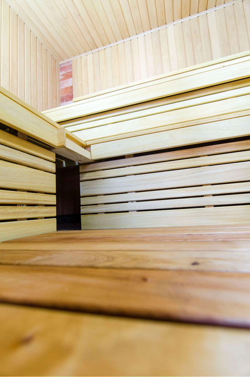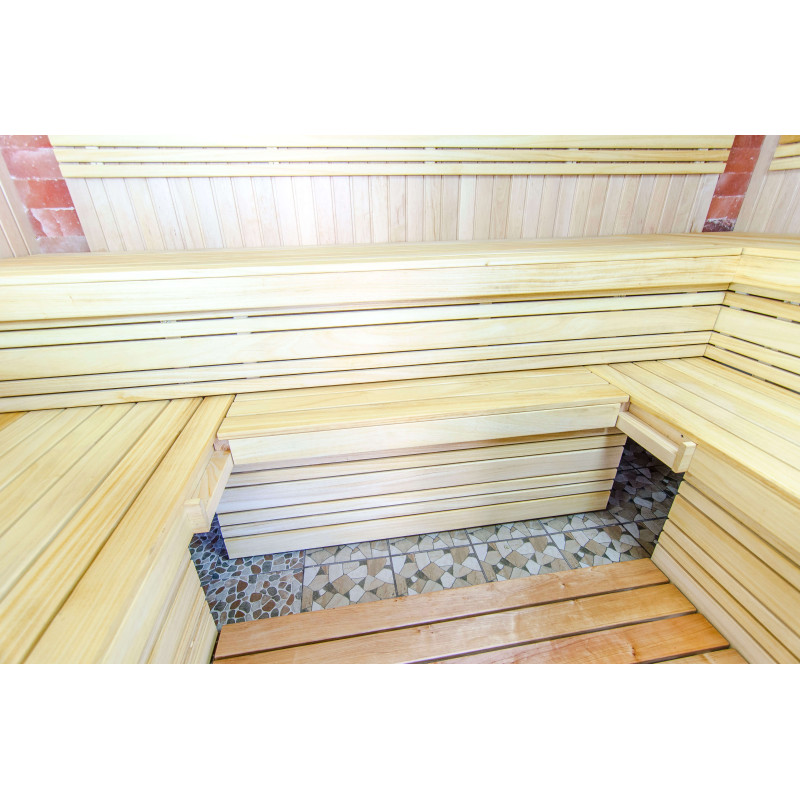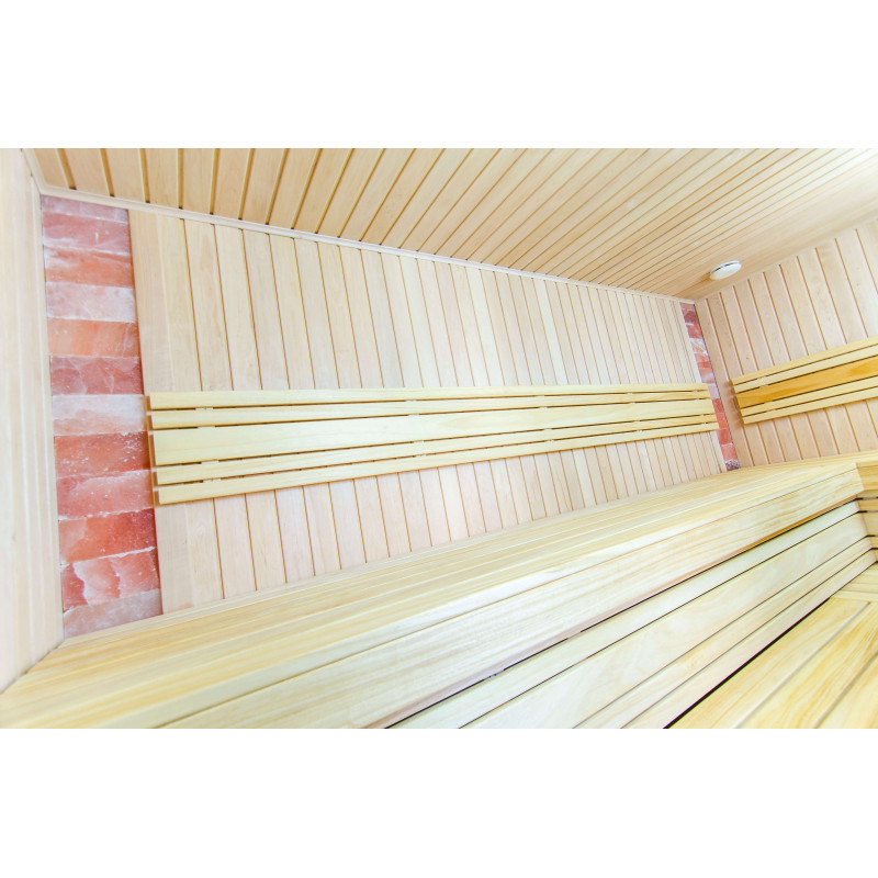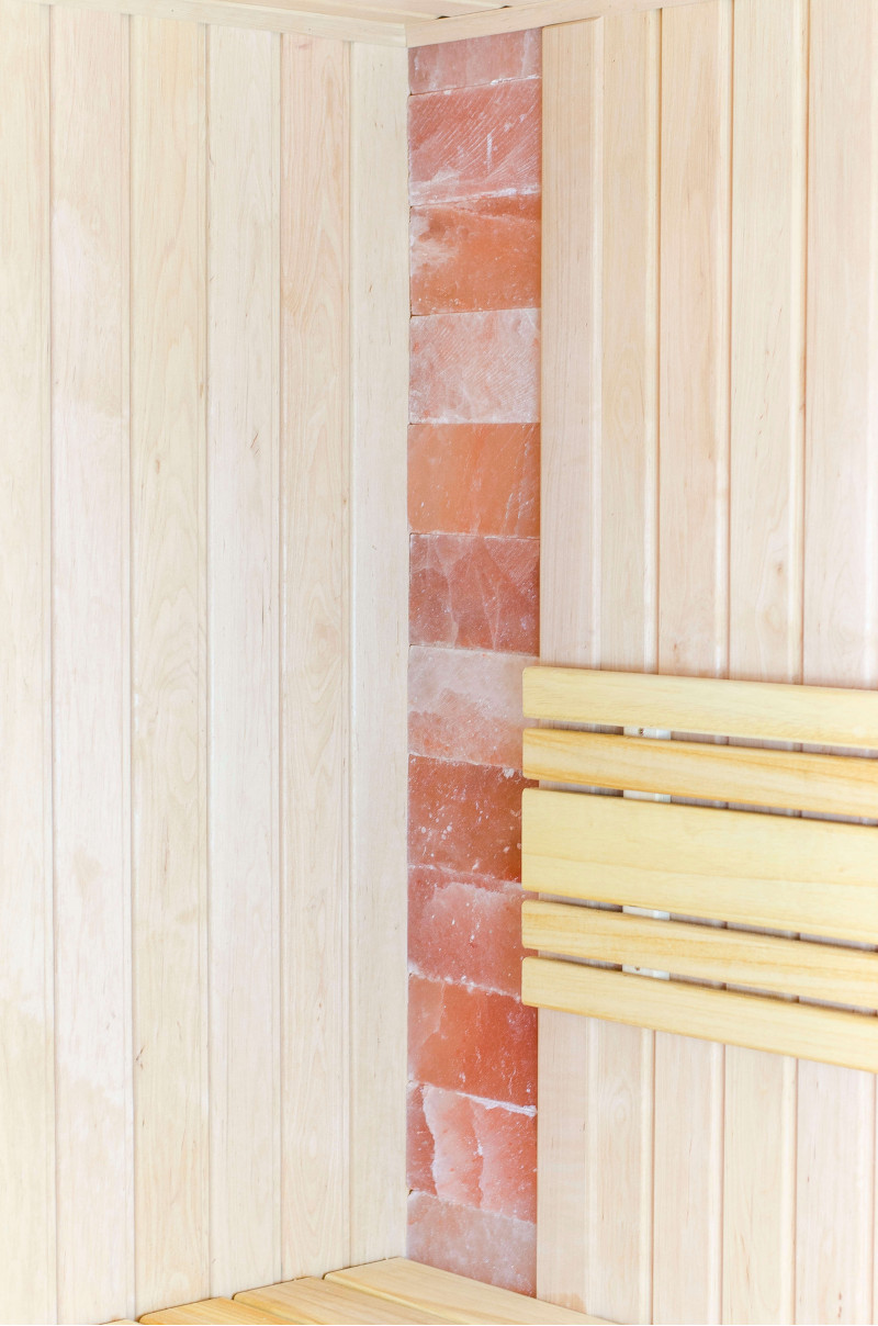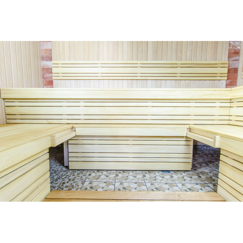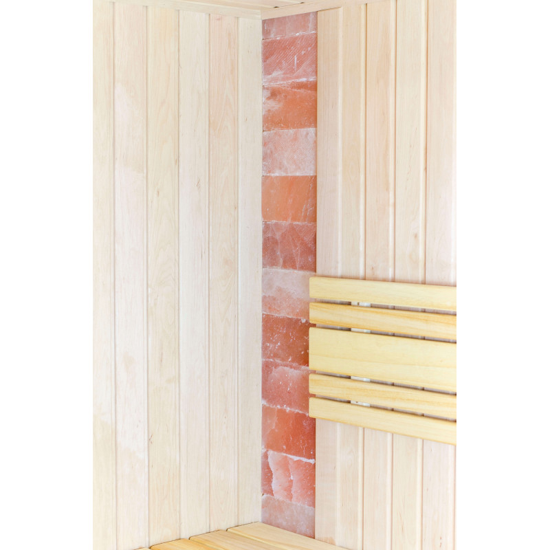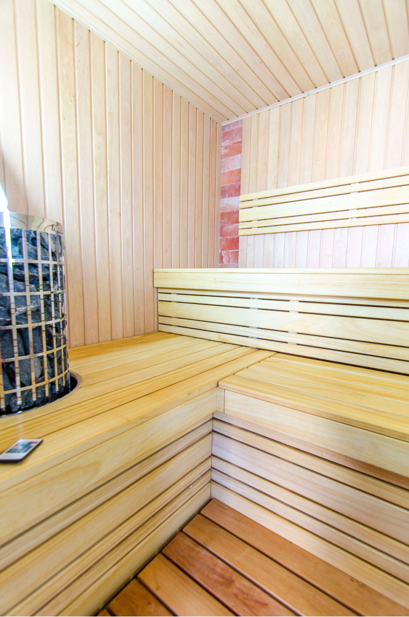 Gultai, nugaros atramos, lubos, sienos - iš afrikietiškos nekaistančios aukščiausios klasės abachi medienos, grindų grotelės - iš juodalksnio medienos. Nugaros atramose ir už himalajų druskos plytų įmontuotas spalvotas RGB apšvietimas, valdomas belaidžiu spalvų keitimo pultu, paryškinančiu išskirtinę himalajų druskos išvaizdą.
