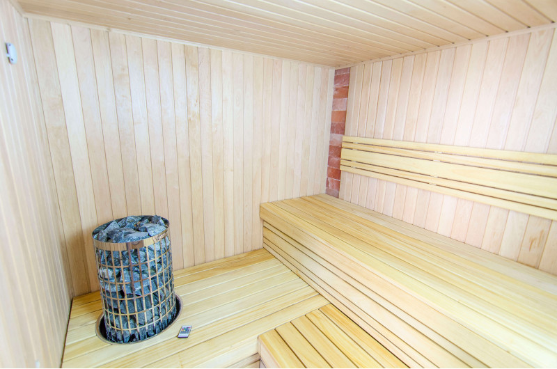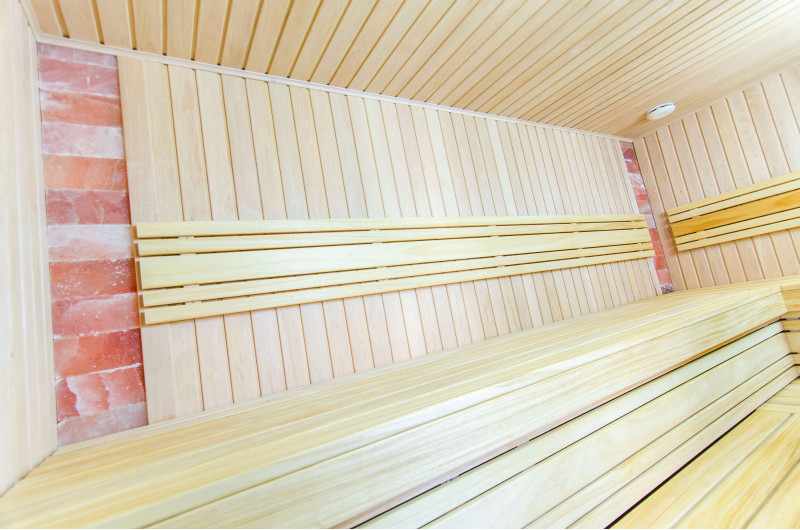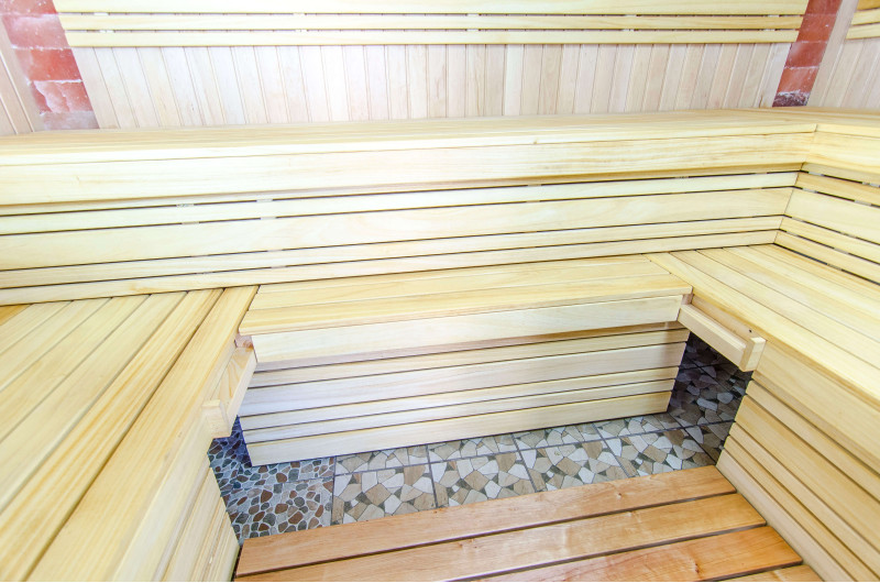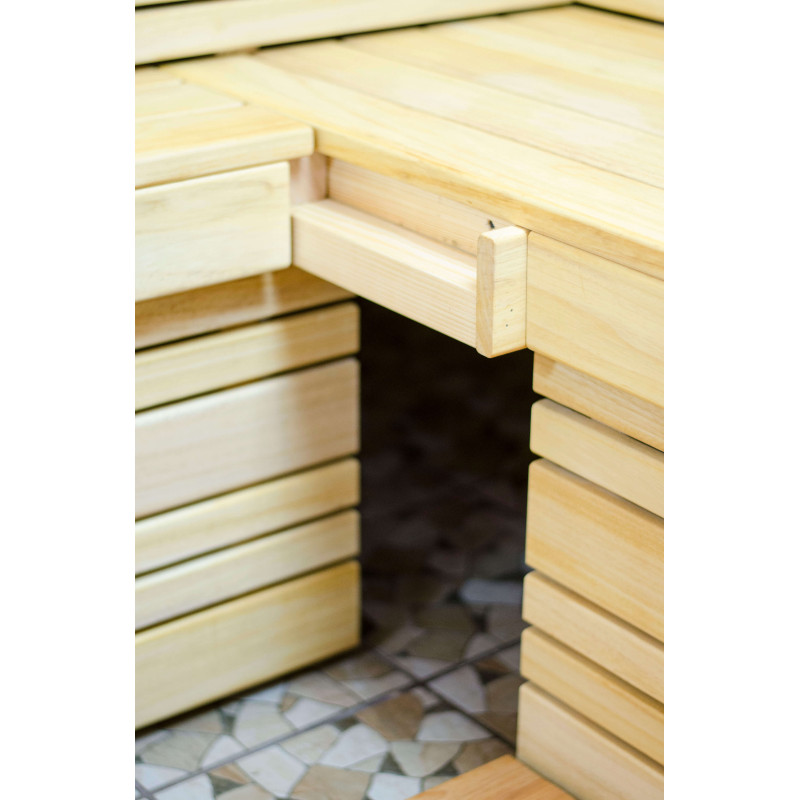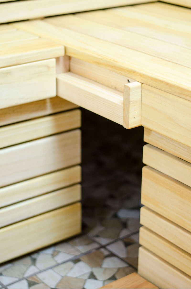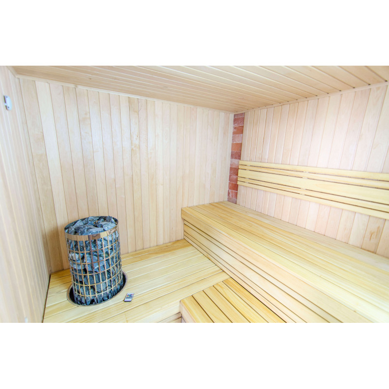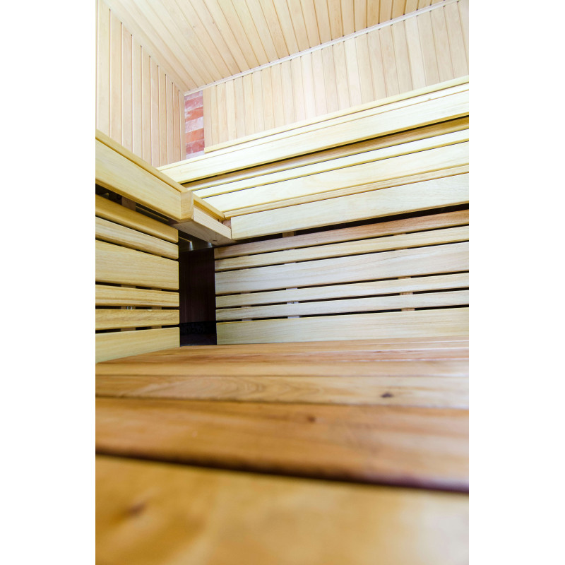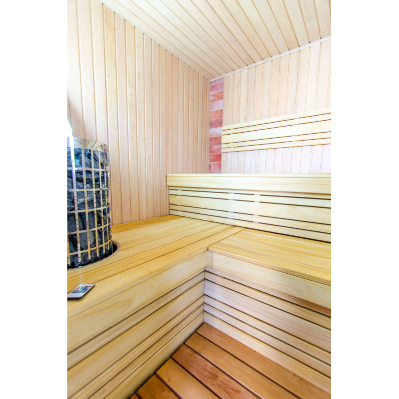 Gultai, nugaros atramos, lubos, sienos - iš afrikietiškos nekaistančios aukščiausios klasės abachi medienos, grindų grotelės - iš juodalksnio medienos. Nugaros atramose ir už himalajų druskos plytų įmontuotas spalvotas RGB apšvietimas, valdomas belaidžiu spalvų keitimo pultu, paryškinančiu išskirtinę himalajų druskos išvaizdą.