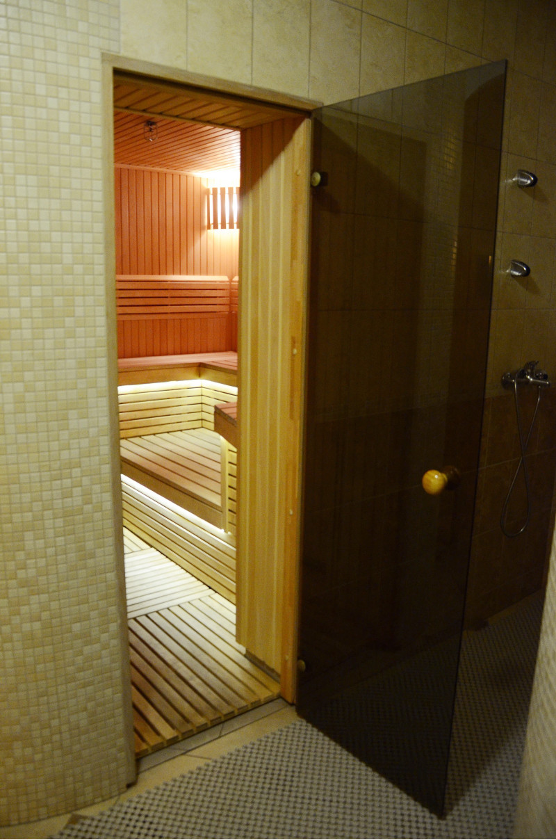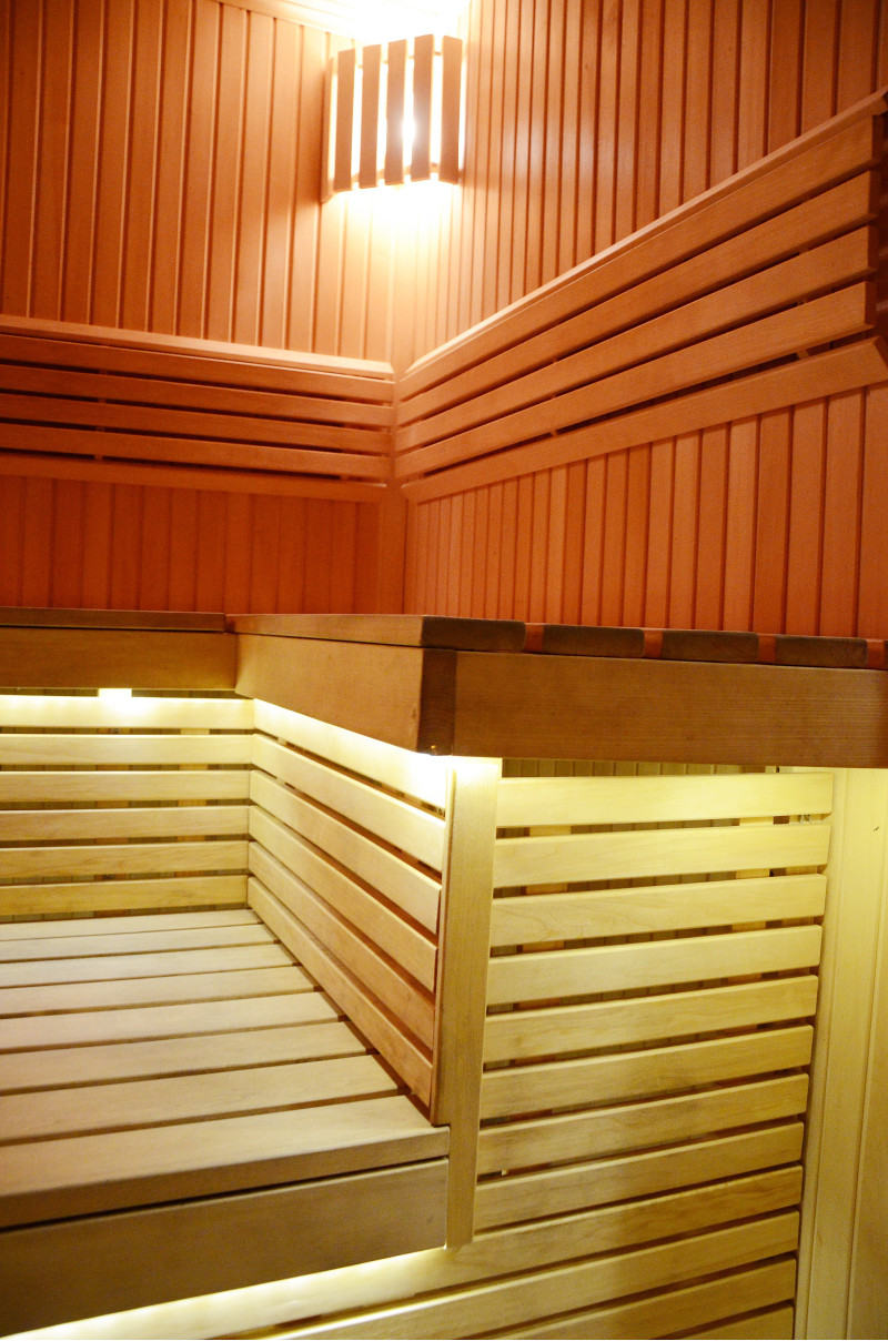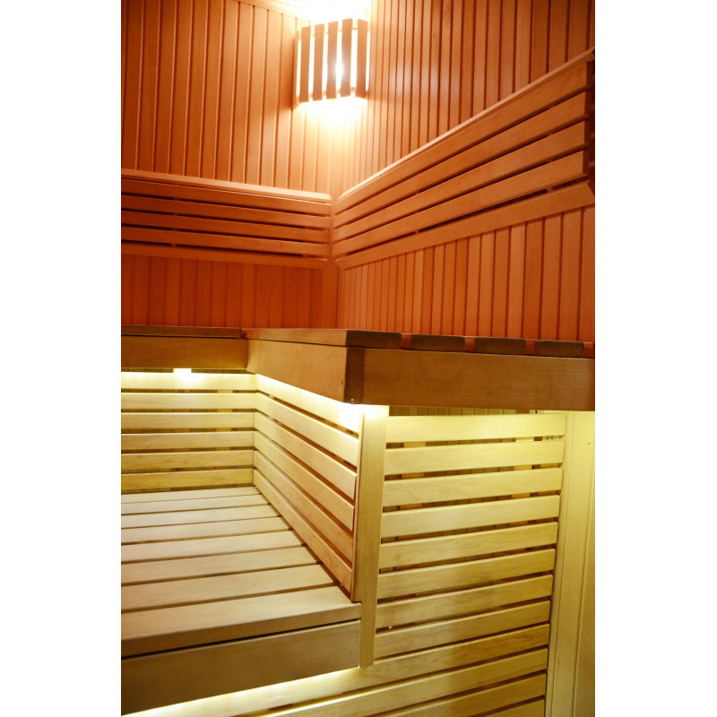 Apšvietimas – viršutiniuose kampuose įrengti 2 Harvia šviestuvai, po gultais - baltos šiltos spalvos LED apšvietimas.