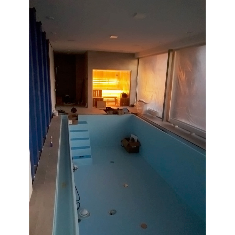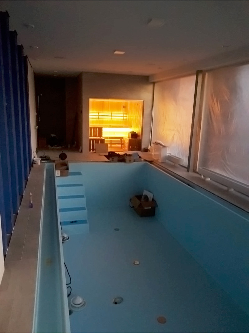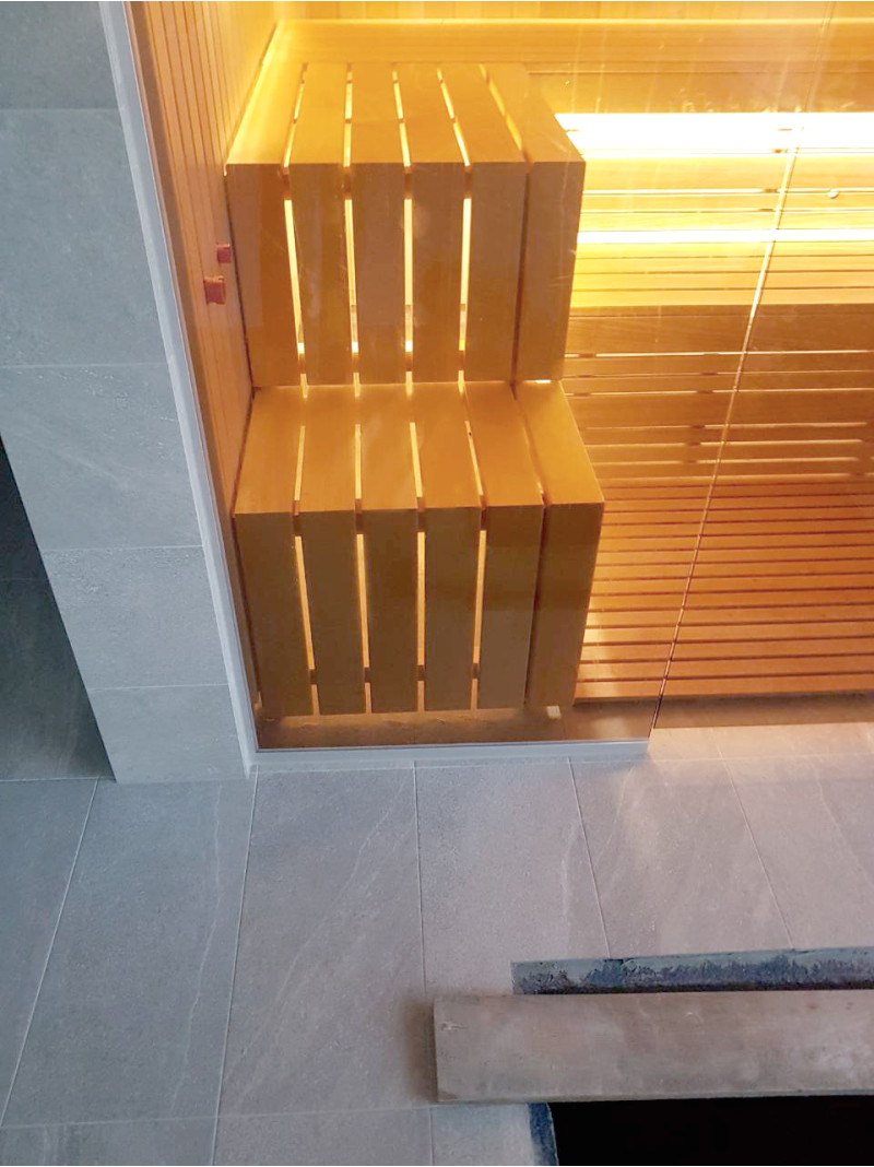 Stiklo vitrinos įrengimas - tonuotas 8 mm grūdintas stiklas aliuminio rėme. Dėka stiklinės vitrinos atveriamas vaizdas į baseino zoną, padidinama maža pirties patalpa, pirčiai suteikiama daugiau šviesos.