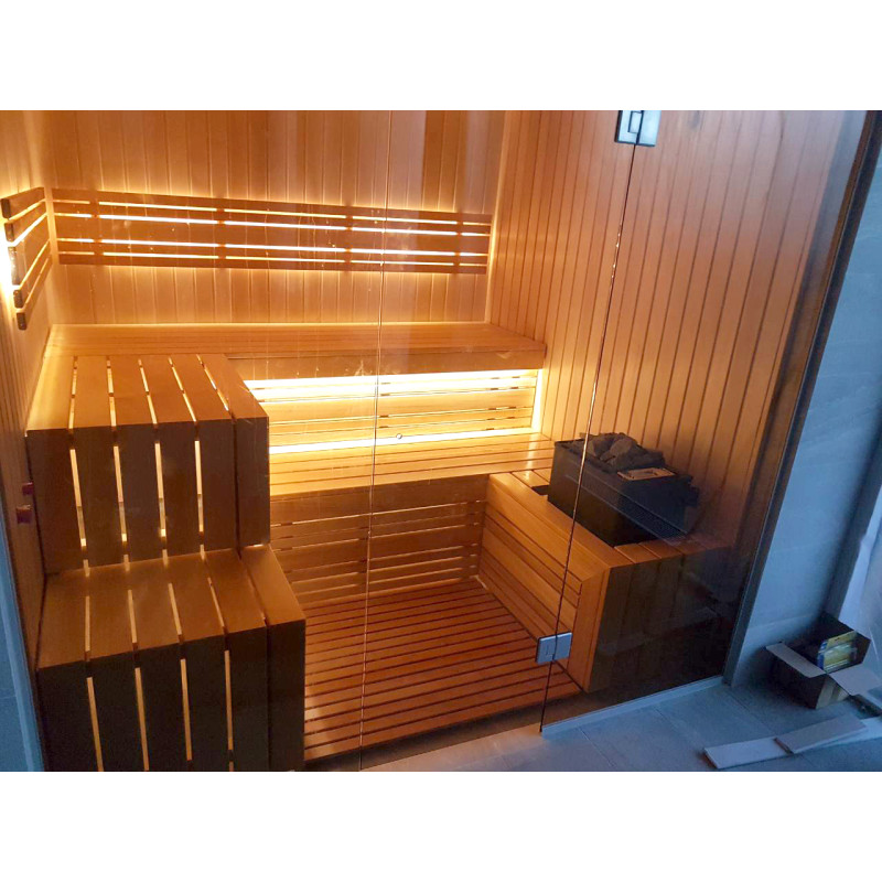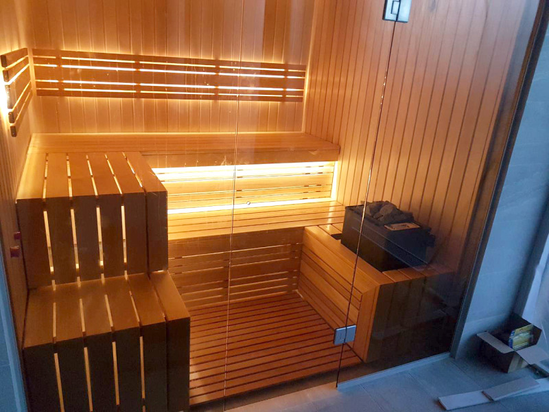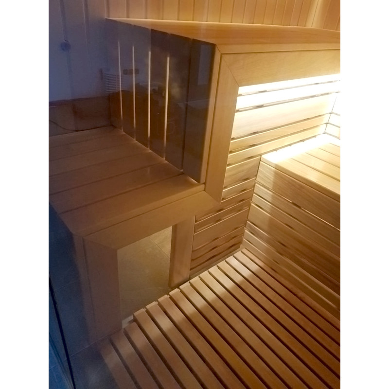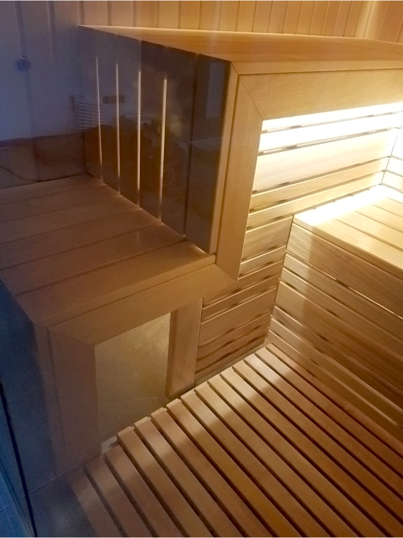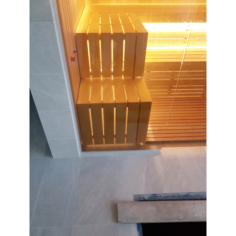 Gultų lentos ir nugaros atramos iš abachi medienos - puikus pasirinkimas, kadangi ši kokybiška mediena per daug neįkaista, sėdint ant iš tokios medienos pagamintų gultų neįmanoma nudegti. Taip pat kedro mediena suteikia modernią išvaizdą pirties interjerui.