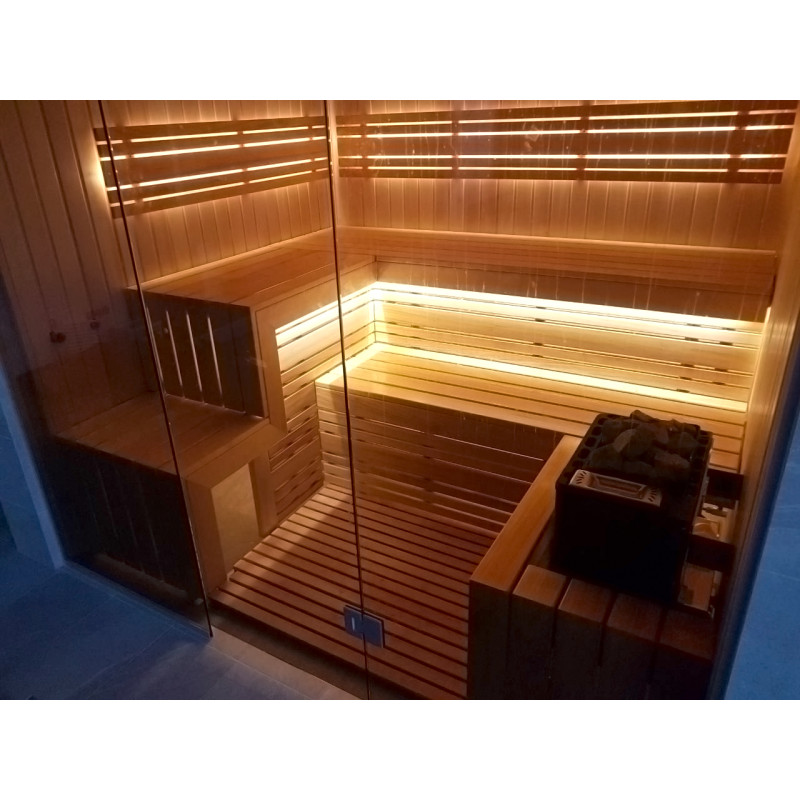 Apšvietimas - nugaros atramose ir po viršutiniu gultu sumontuotas drėgmei ir temperatūrai atsparus baltos spalvos LED apšvietimas, paryškinantis dailylenčių išvaizdą ir tekstūrą.