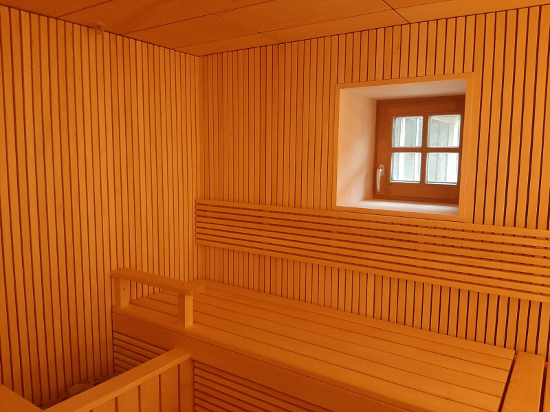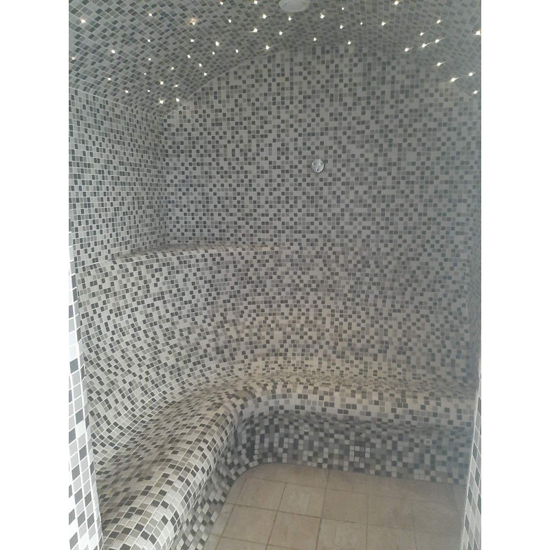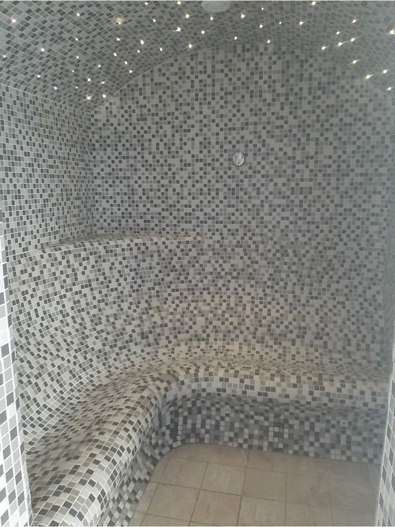 - Garinė pirtis - naudotos medžiagos, kurios atlaiko itin aukštą temperatūrą ir labai didelę drėgmę. Lubos - arkos tipo, kad garo kondensatas nevarvėtų ant pirtimi besimėgaujančių žmonių. Apdailai pasirinktos plytelės, o luboms - šviesolaidinis apšvietimas, sukuriantis žvaigždėto dangaus efektą. Gultai gaubti, ypač patogios formos.