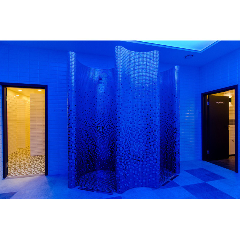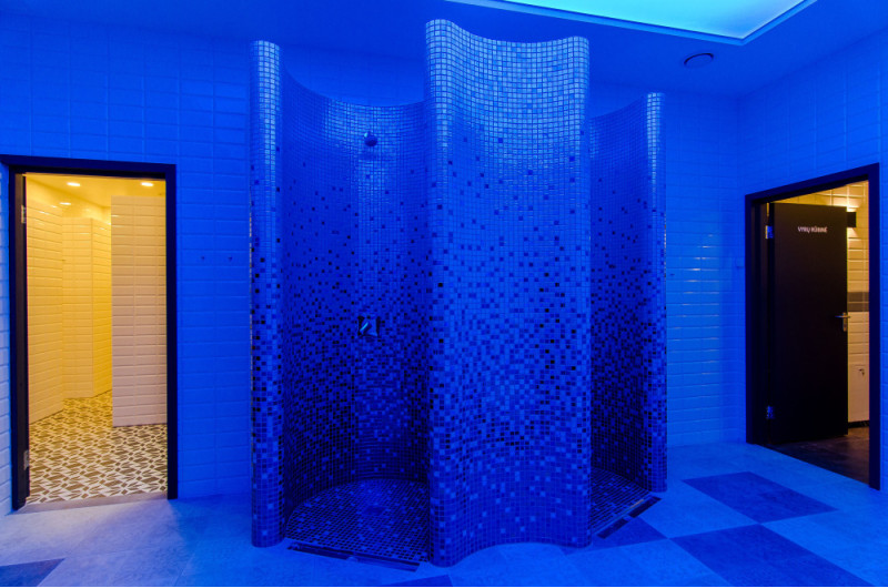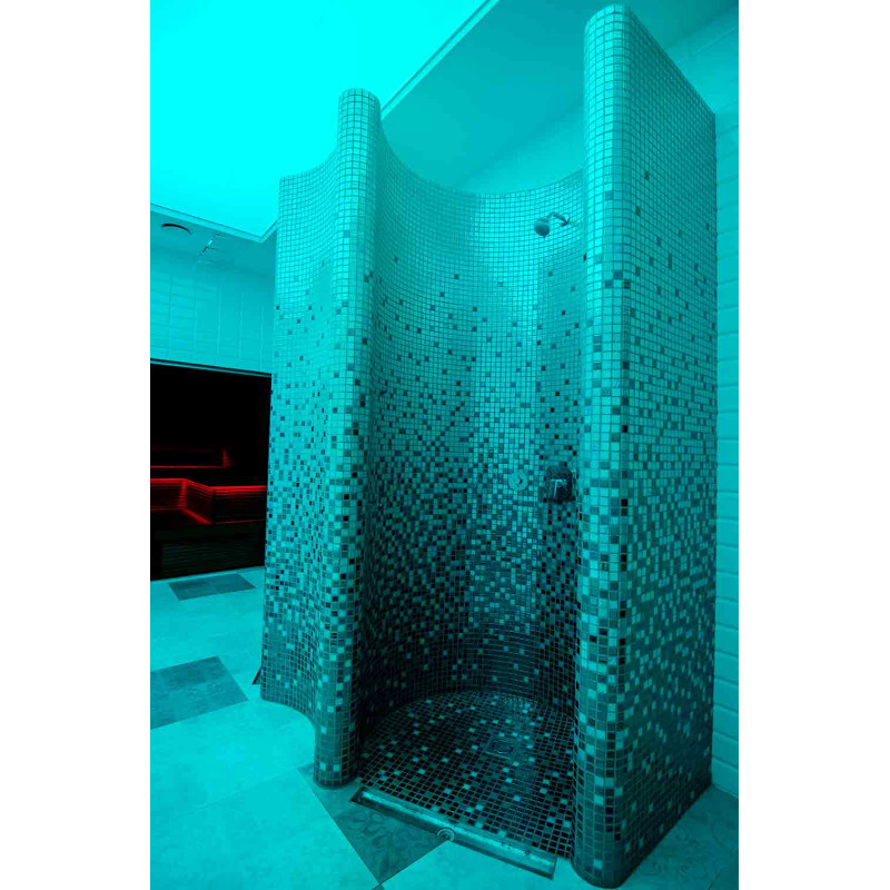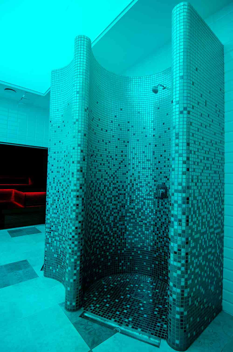 Dušų formos gamintos iš XPS 300, naudojant spec. pjaustymo technologiją pagal individualų projektą. Formos sumontuotos, hidroizioliuotos teptine hidroizioliacija Schonox. Suklijuotos mozaikinės plytelės, pritaikytos pagal išlinkį ir užpildytos pilkos spalvos Schonox hidroizoliacija. Dušai - skirtingos paskirties. Vienas jų - paprastam prausimuisi, kitas - atsivėsinimui po pirties, su šalto vandens šoniniais purkštukais.
