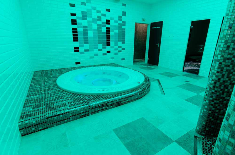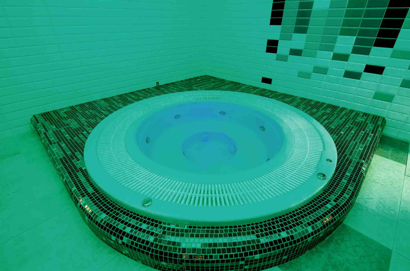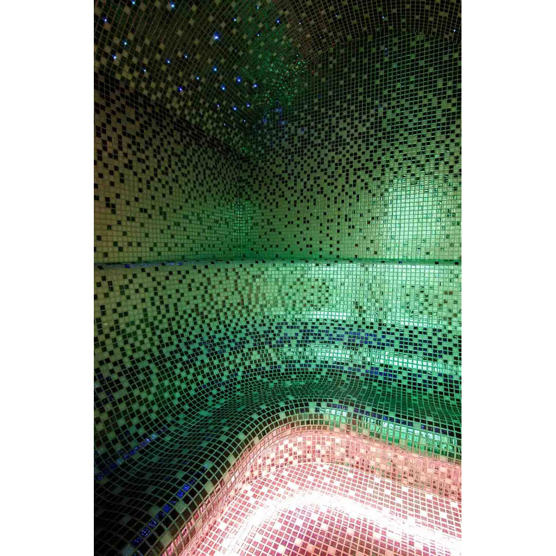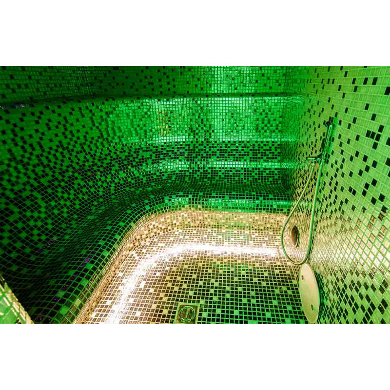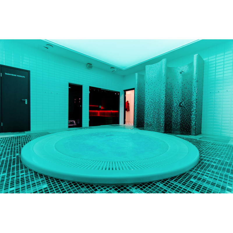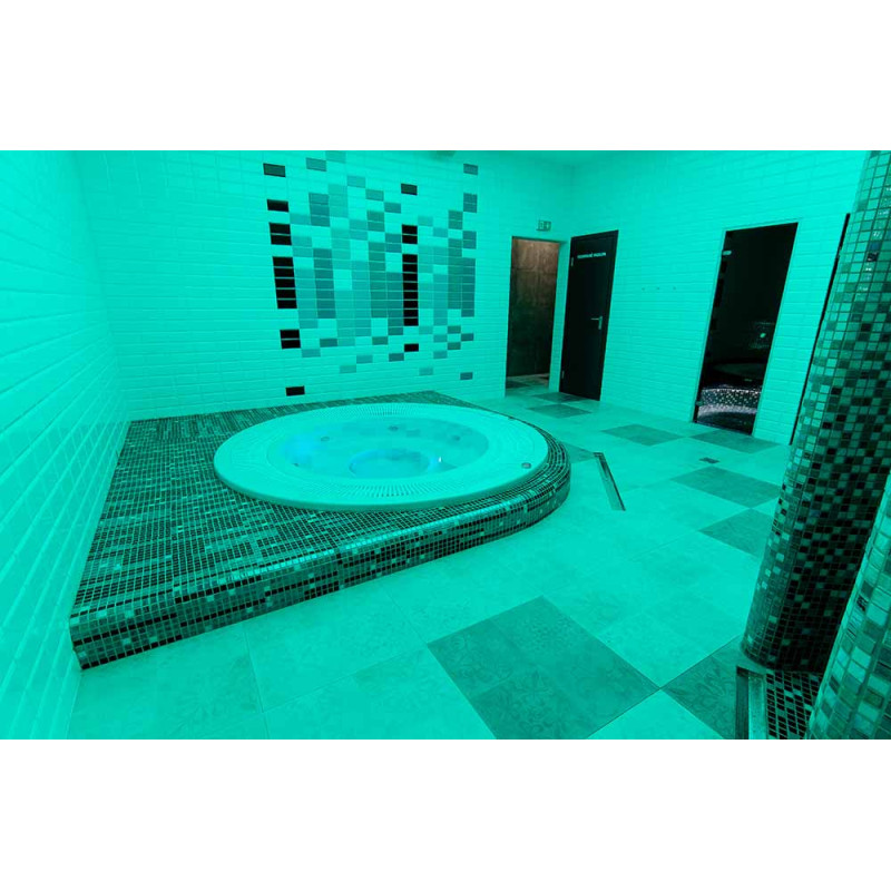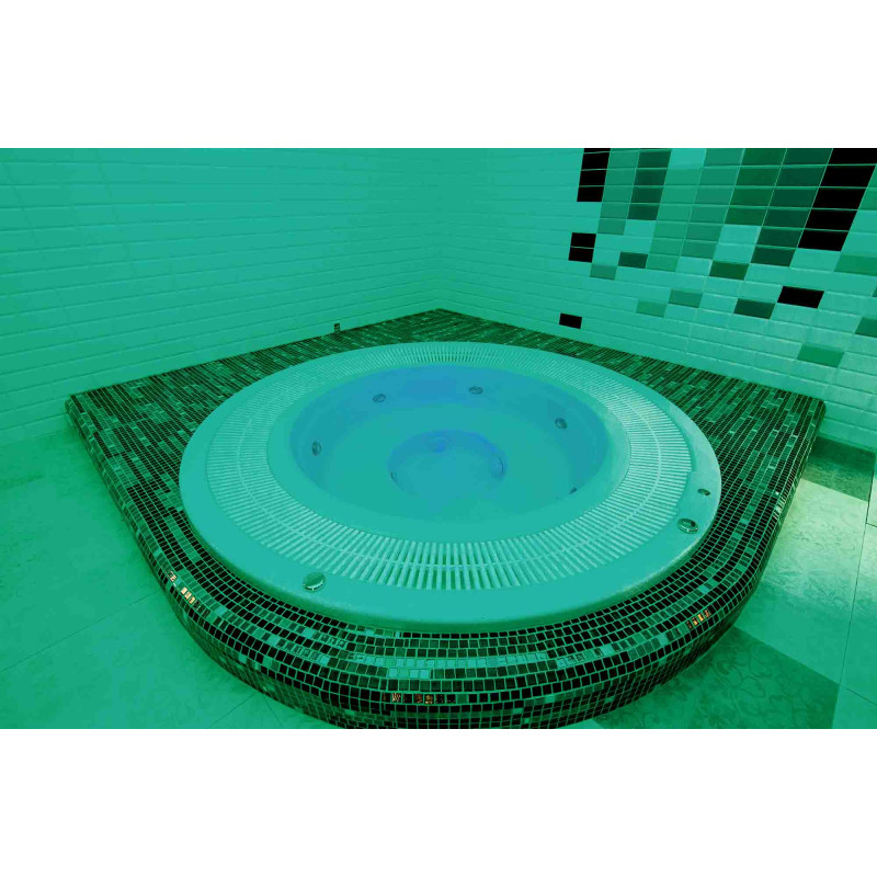 Hidromasažinis baseinas - komercinės paskirties. Plytelės aplink baseiną - stiklo mozaika. Įranga: