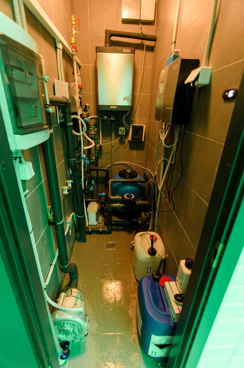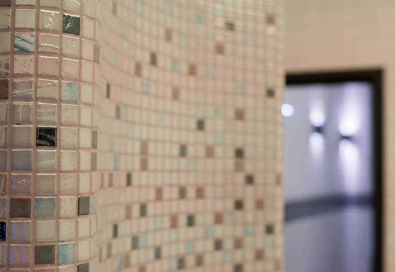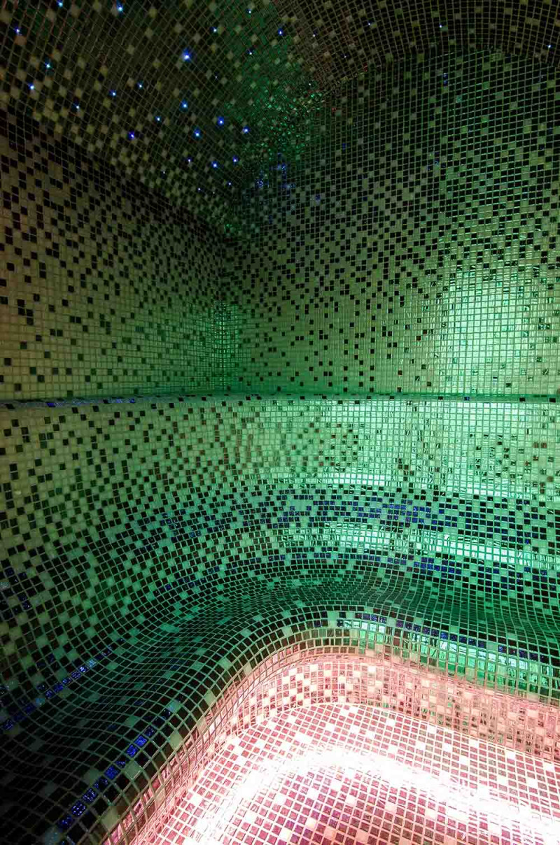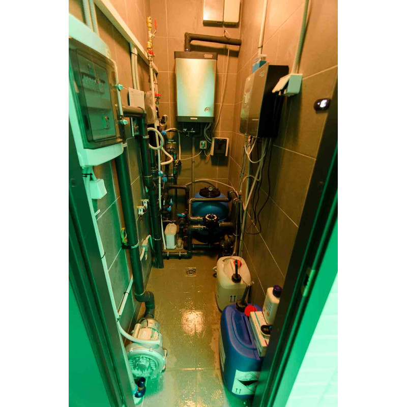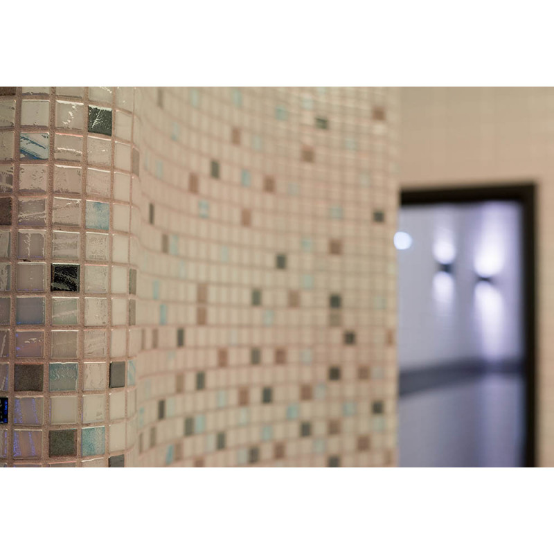 Hidromasažinis baseinas - komercinės paskirties. Plytelės aplink baseiną - stiklo mozaika. Įranga: