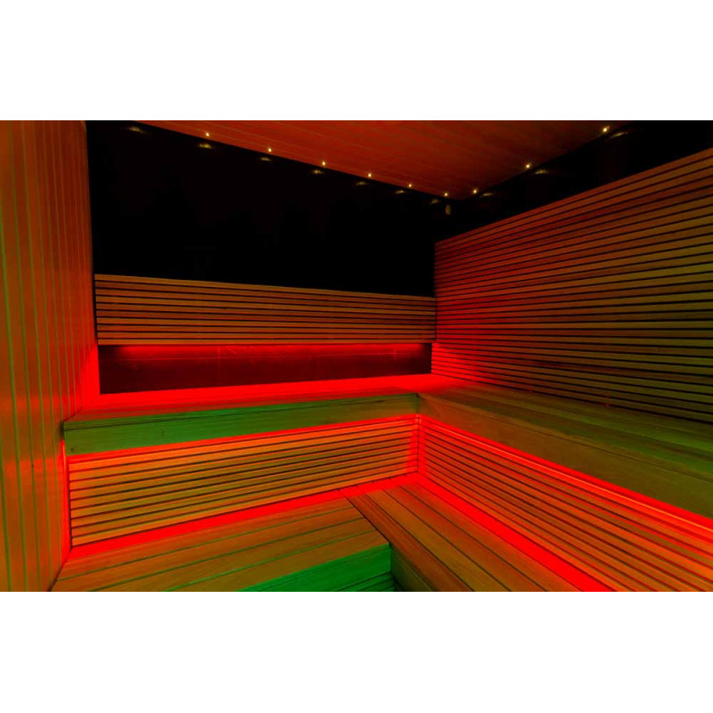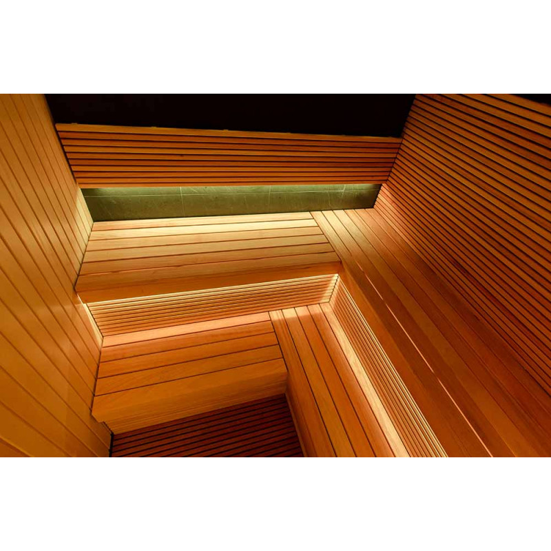 - be puikaus vaizdo, saunos malonumą stiprina ir garsas - po pirties gultais įmontuoti garsiakalbiai atsparūs pirties drėgmei, korozijai ir temperatūrai,